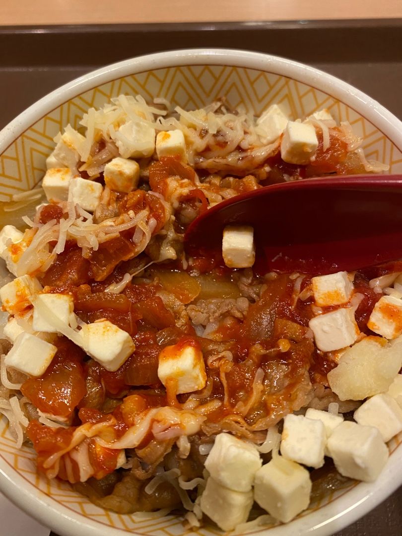 イタリア風の牛丼ですね。トマトソースとチーズが印象的な牛丼です。