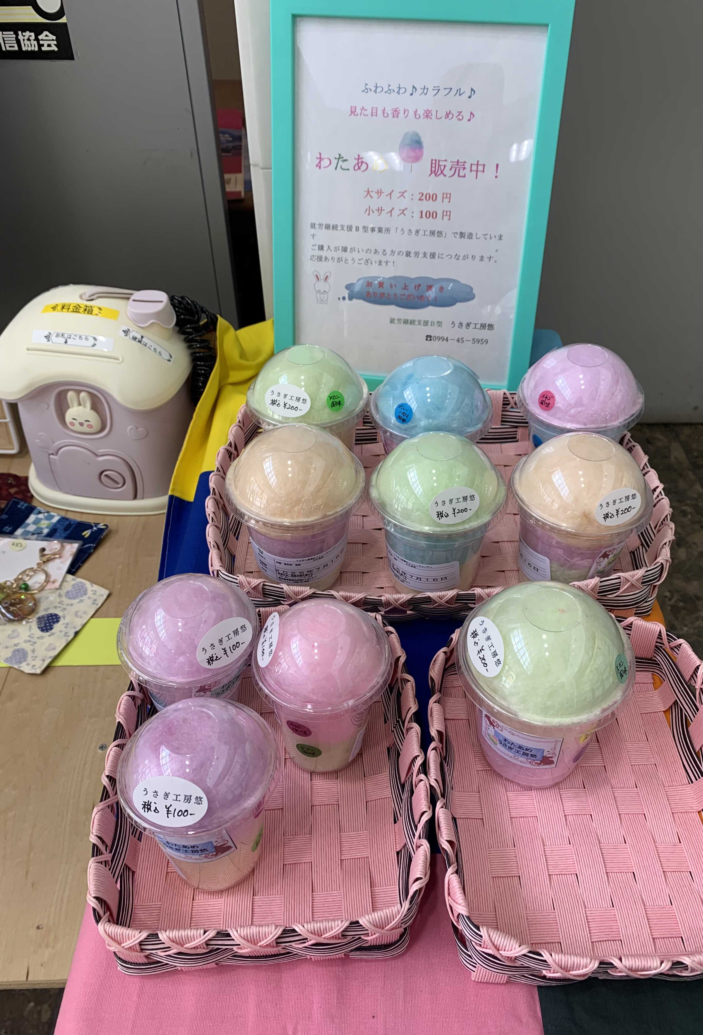 こんにちは♪うさぎ工房悠です🐰今日はうれしいご報告があります!\本日より、鹿屋郵便局さんで/✨「わたあめ」の販売がスタートしました✨ふわふわ、カラフル、ほんのり香る目でも楽しめる大人気スイーツ🍭事業所の仲間たちが、ひとつひとつ丁寧に仕上げています。📌大サイズ:200円📌小サイズ:100円そして今回のわたあめは、うさぎ工房悠のハンドメイド商品たちのすぐお隣に並んでいます🧵🎀手づくりの温もりと、ふんわり甘い香りに囲まれて、どちらもぜひ手に取っていただけたら嬉しいです♪郵便局にお立ち寄りの際は、ぜひチェックしてみてくださいね☺️ちょっとしたおやつや、ギフトにもおすすめです♪地域の皆さまに、ふんわりやさしい甘さをお届けできますように💗これからも「うさぎ工房悠」をよろしくお願いします!#鹿屋郵便局 #うさぎ工房悠 #就労継続支援B型 #わたあめ #手作りスイーツふわふわの甘さが、みなさまの日常にちょっとした癒しを届けられますように🌸今日も良い一日になりますように…🐇これからも地域の皆さまに笑顔を届けられるよう、ひとつひとつ心を込めて取り組んでまいります。今後とも、どうぞ温かく見守っていただけましたら幸いです🐇