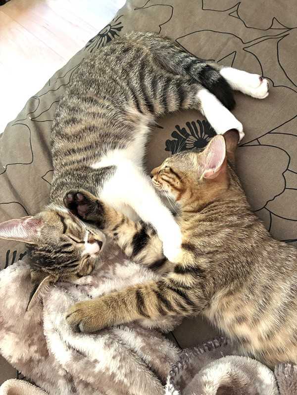 現在 うちにはむーさん と言う 13歳のメス猫がいます。去年の秋まで はーちゃ と言う 11歳のメス猫も暮らしていました。リンパ腫にてお空に 旅立ちました。在りし日の はーちゃ そして、今日8月30日(土)我が家に新しい 家族が増える事となりました。お話を頂いたのは 2日前の8月28日の夕方です。この日は 地域のゴミ置き場の カギ当番だったのでガチャガチャ していると近所の人に 「 あの~~ 」と声をかけられました。( うちの班はそこにゴミを出していないので初めましての方です。)お話を聞くとその方が 1か月前から 保護した子猫を2匹お世話していて、飼ってくれる人を探しているとの事。私は、それを聞いて 直ぐに 引き取りたいと 思いました。更にお話を 聞くとその方も 1匹 前に保護した猫と暮らしているが理由がおありで 今の子以上は 迎えられないとのこと。うちも むーさん との相性やむーさんの 年齢 など考えて悩みましたが夫さんとも 話して兄弟の子猫2匹とも受け入れることにしました。もし 様子を見て 無理そうならその時は 責任をもって最善の方法を探そうか。ということで2日後に引き取りに伺った足で病院に行き健康診断と 性別判断と ワクチン接種ノミ・ダニ退治をしていただき虫下しのお薬をいただいて(ウリザネジョウチュウがいたので)家に帰ってきました。この後は ワクチンをもう1度打つのとウイルス検査をして結果が出るまでは隔離部屋にて過ごしてもらいます。実はむーさんも 昨日病院に行ったので今日は良く寝ています。ふふふまだ、子猫が家に居ることを 認識していません。子猫の 名前はなむくん(手前のギジトラ)と あみくん(奥の白キジ)ですナムアミダブツ から いただきました。南無・なむ は ”お任せする” とか ”感謝する” とか ”尊敬する”といった意味があるそうです。阿弥・あみ(陀)だ は”計り知れない” ”無限の恵みをもたらす命”だとかわ~~~すごい。。まあ、深い意味は置いといて呼びやすそうだったので決めました。みんな、よく眠っています人間でいえば 70歳手前の おばさま猫 むーさん と5歳児 男子の なむ あみくん は数か月先のご対面になるけどにぎやかに なるぞ=== 楽しみだ~次回、予知夢を見た??という 記事を書こうと思います ꕥ