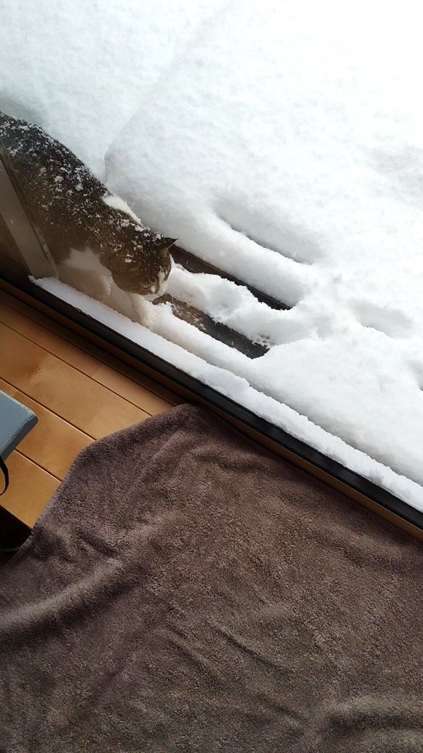 大雪で 大変な思いをされている方々 すみません 雪が あまり降らない地域の私どもは( 私と猫 )雪が降ると 浮かれてしまうのです。うちの 猫 むーさん に雪を 見せてあげよう匂わせてあげよう ← 飼い主が反応を見たいだけと 戸を開けてみたら前脚で ちょんちょん と雪に触れむーさん 「 よし いける 」てなもんで出て行ってしまった。数秒で Uターン して 戻ってきました。毛皮を着ていたって 肉球は 裸んぼうむーさん 「 お~~ ひゃっこい ひゃっこい 」むーさん 「 帰ったぞーーい 」私 「 ぎゃーー 雪猫 入って来た 」あんたが 出したんやろ1分も 外に居なかった と思うけど思ったより 猫に雪 が乗っていて飼い主の方が アタフタ してしまった。むーさんは いつもと 違う様子にパトロール せねば と思ったのかも 知れない。現在 35cmの積雪未だ積もりそうです。おとなしく 用事もキャンセルしてお家で過ごそう皆様も どうぞ お気をつけて。