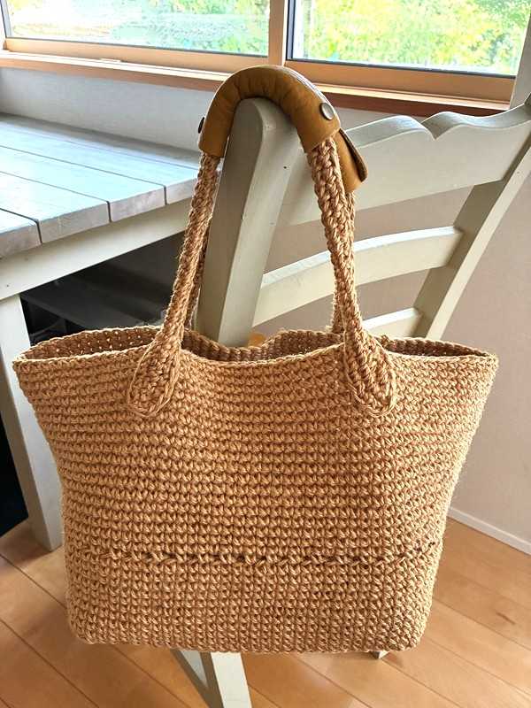 いやはや 暑いので室内で出来る事はないかと考えていたところ昨日から、編み物を始めました。麻ひもで編む バッグです。これはもう、15年ほど前に 編んだ手提げです。夏しか使わないので まだまだ綺麗です。ほとんどが コマ編みで ポイントで中長編み?かなあどうやって このように出来上がったのかむかし過ぎて もう分からぬよ今年、取っ手カバー? と でも言いますか皮を巻き付けました。中 には 黒い プラスチックの板を 敷いています お財布 携帯電話 カギ ハンドタオル リップクリームエコバック なんかを入れると中で 動いて整頓しにくいですけどね。。最近編み始めたのは畑作業で使う カマ や ハサミ、紐なんかを まとめて入れて持ち歩く道具袋です今使っているのは やはり10年以上前に麻ひもで 編んだもので道具袋の持ち手部分が ちぎれて 来ていたのです。これは底の部分の始まりです。糸が 変色してしまっていますが細長く底の部分を編み浅く立ち上がって取っ手を付けていく予定です。初日は 2段 編んで指が痛くなったので もう お終いにします。麻ひもは 毛糸と違ってゴワゴワ なので誘導している 人差し指の付け根が直ぐに痛くなります。 そうだ、それで前は絆創膏を貼って 皮膚を守って編んでたっけこれで 痛くないぞ