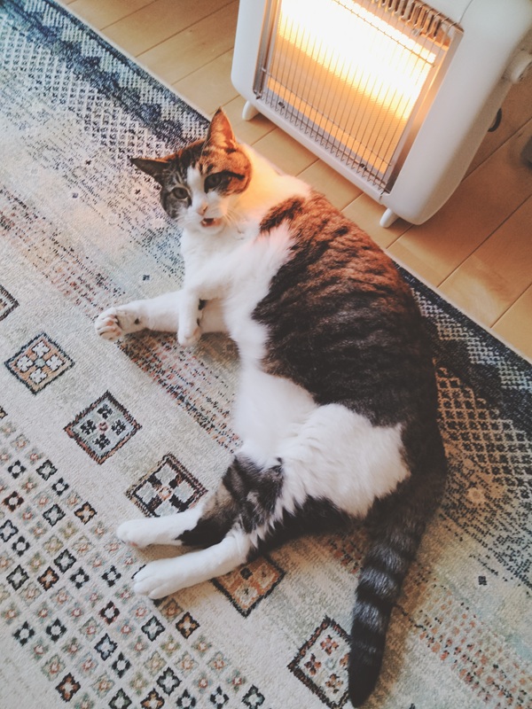 こんなに涼しい 4月下旬は近年 久しぶり な気がします過ごしやすくて 嬉しいですが急に 暑くなっても 体が しんどいので夏が 猛暑で無いと 助かるなあさて うちの むーさん(猫)私が朝 起きると 鳴いて何かを催促しているようでご飯も お水( 未だぬるま湯を好む )も済んで鳴いていたので電気ストーブを 久しぶりにつけると暖をとりはじめましたそして この顔で にゃーお「 寒かったよう もっと早く つけてよ 」と でも 言っているでしょうかごめん ごめんしかし むーさん近いな~~ よっぽど 寒かったのかストーブに 近いな~~下の ホットカーペットも 点けよう「 わーーい 」うわあ 無防備だわお腹に 顔を うずめたくなるなぁしかし 蹴られるかもしれないので横に 失礼して添い寝 にしときます