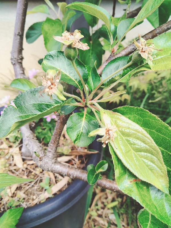 本日は 暖かな日で気持ちが良いです。先日、我が家でお見合いがありまして。青りんごの グラニースミス と姫リンゴの プロフュージョンその時の様子は こちらその後の ご報告 です話は 上手くまとまったのか と 私は 陰ながら 見守っておりましたこの様にお花の 下に ぷっくりと実 らしき 膨らみが ありました。よっ ご両人 ♪1節 から 5個も6個も りんごが出来ては木に 負担がかかりそうなので摘果 していきます。 もったいないですけど大きくて形のいいものを 1節に1つにしました。ピンぼけ~~大体 ザっと見で15個 くらいになりました。植木鉢に生息しているので これから 更に 少なくした方が良いのかもしれないこの様に沢山 受粉が 成功しておりました。1つ ハサミで 開いてみるともう 種らしき ものが 形成 されています兄弟達が 収穫まで 行きましたら大事に いただきますので今回は ご苦労様でした。さて今年 久しぶりに栽培した スナップエンドウ が 実ってきました。苗を植えたのが 遅かったのとプランターなので 少しゆっくりですが十分に 収穫できそう。毎日 外に出て見回りが楽しい季節ですな~