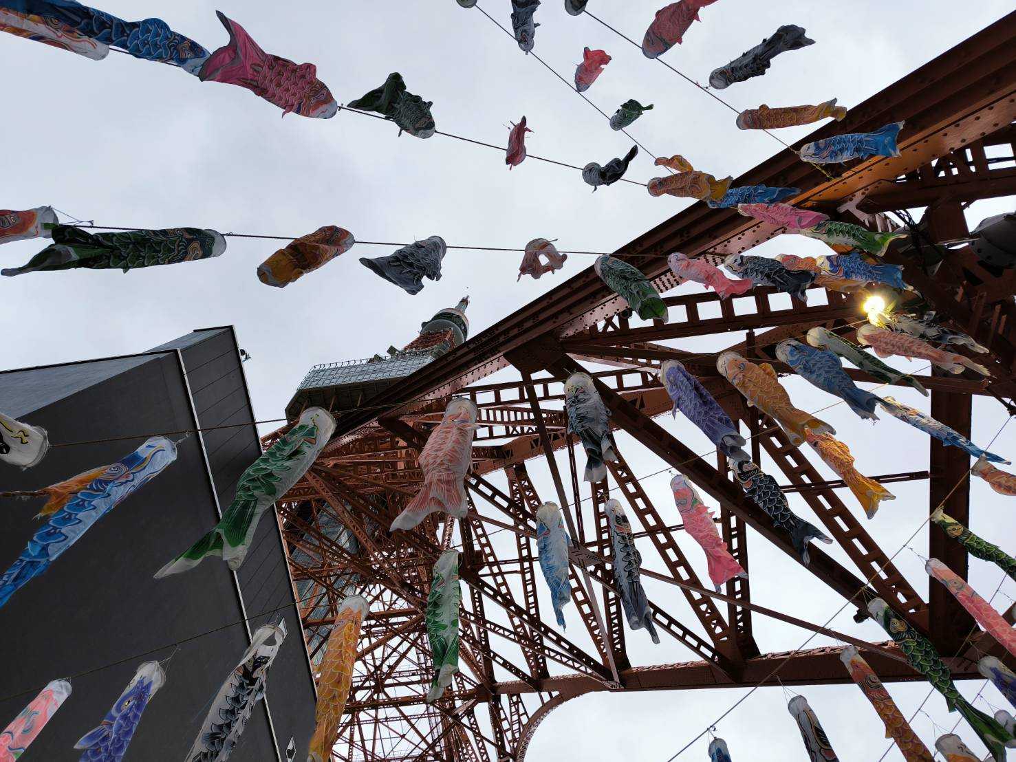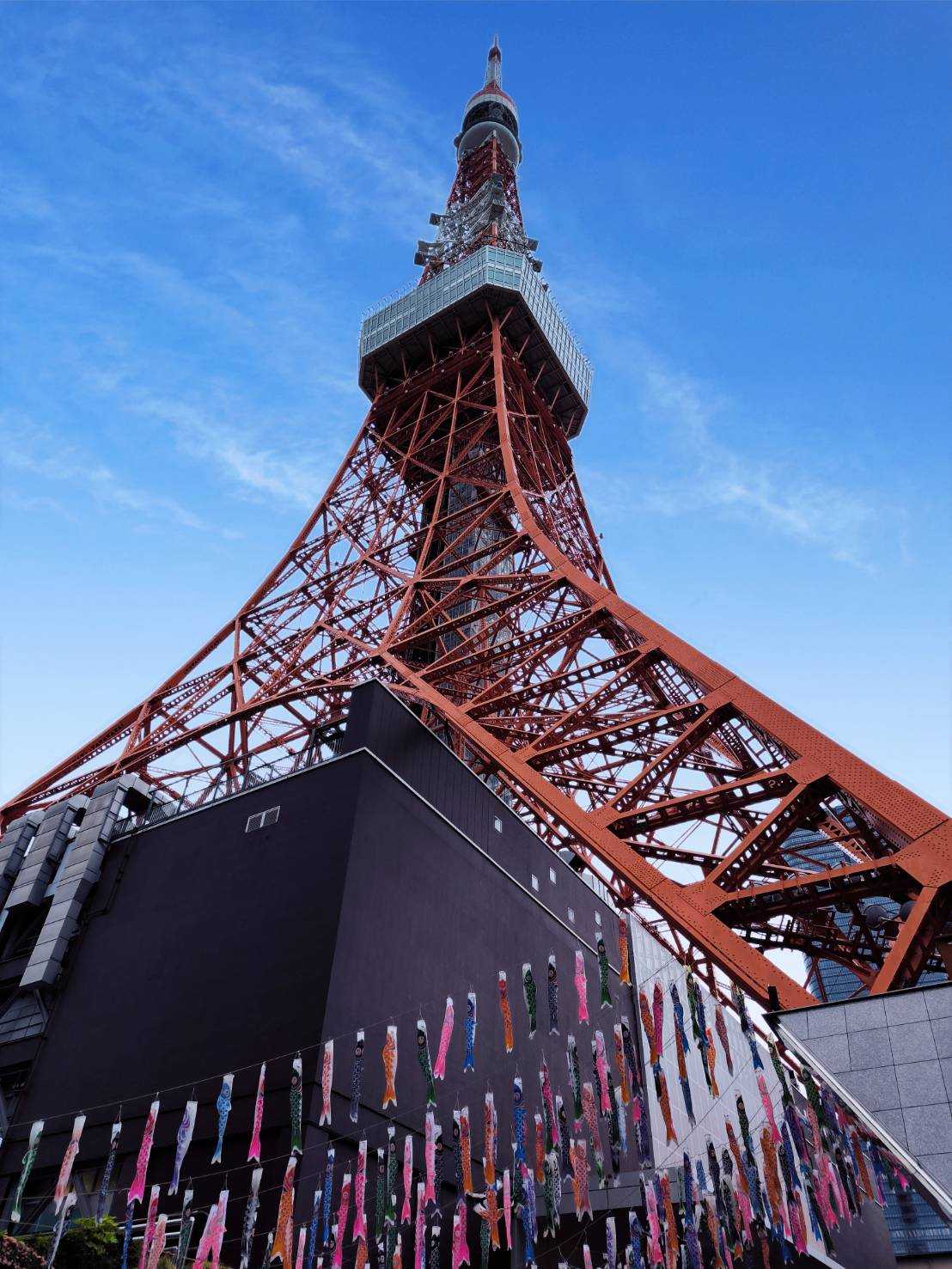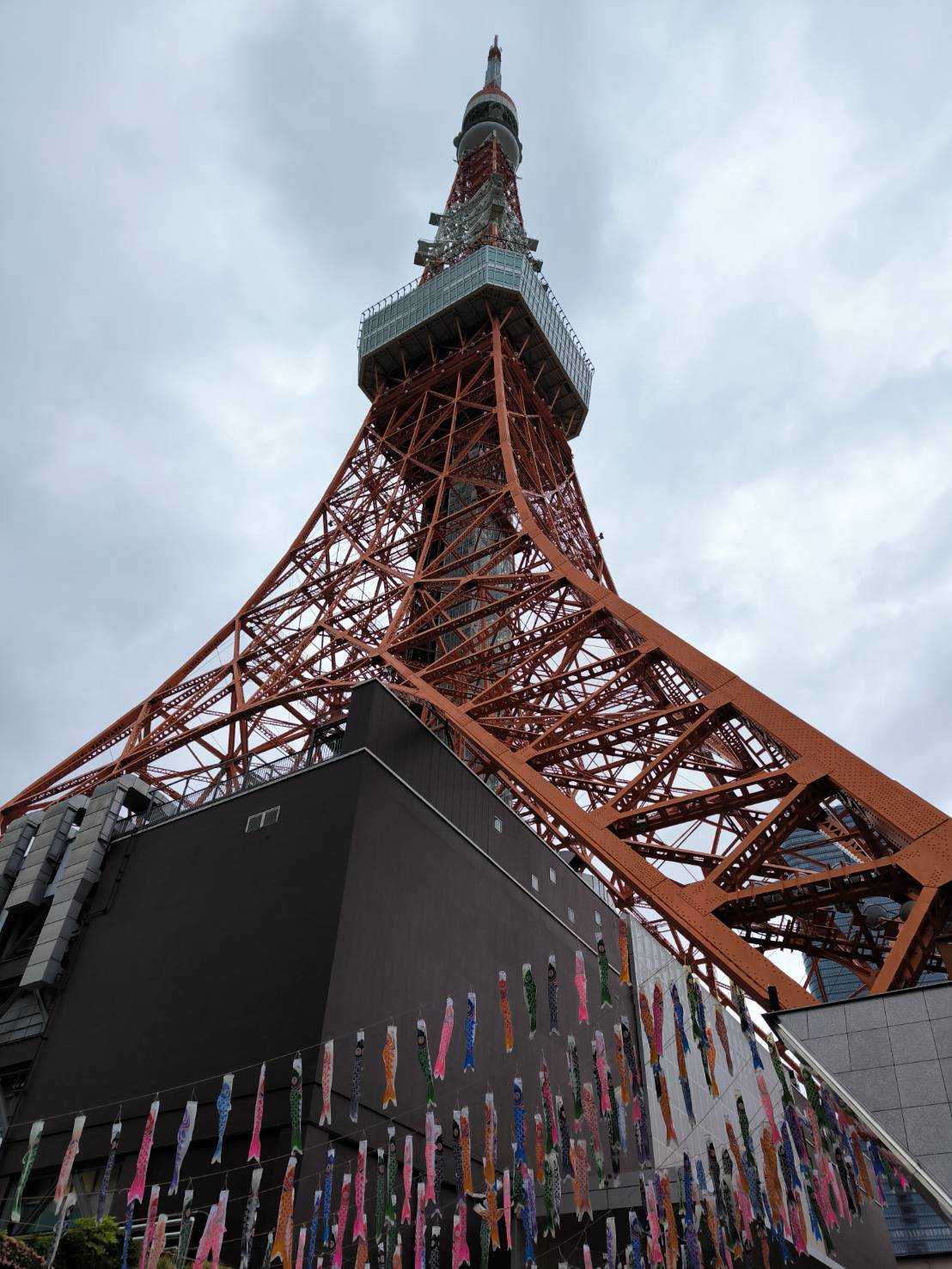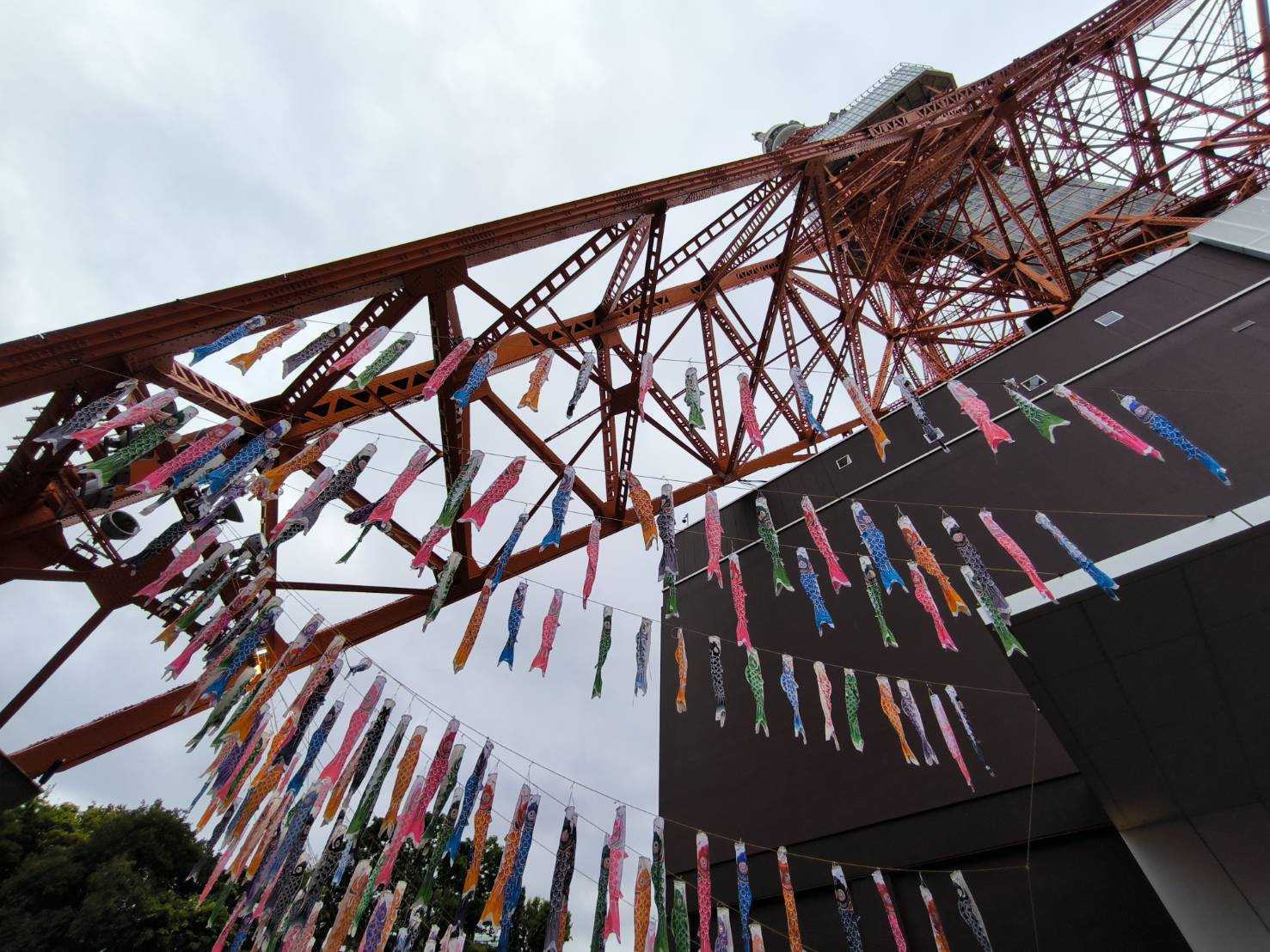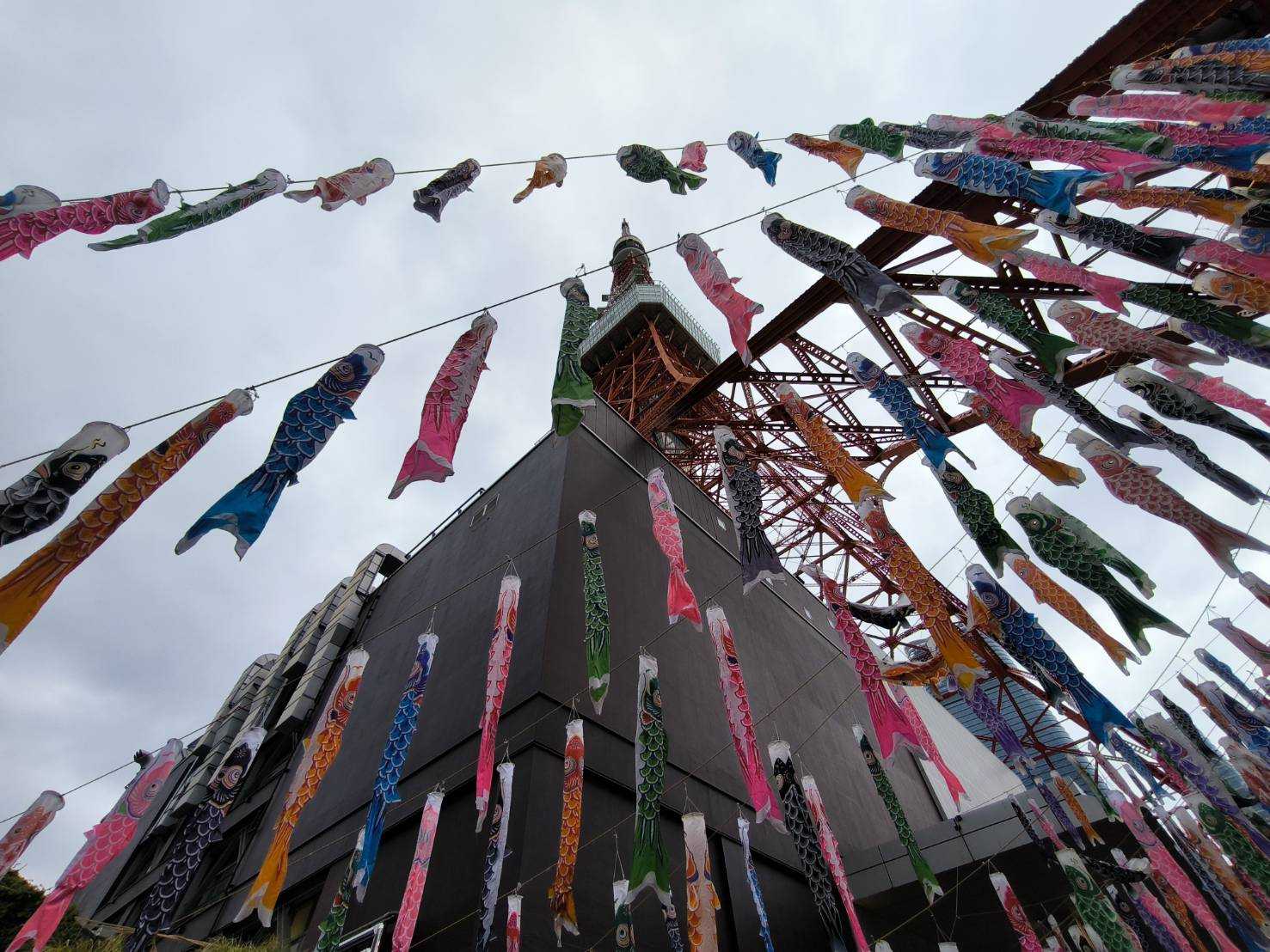 赤羽橋駅を出ると東京タワーがこんにちは。こちらは少し歩いたところです。台湾かな?お祭りもしてました。東京タワーとたくさんの鯉のぼりです。この日は風が弱くほとんどの鯉のぼりが真っ直ぐでした。別の角度から曇っていたので青空にしたものも載せます。