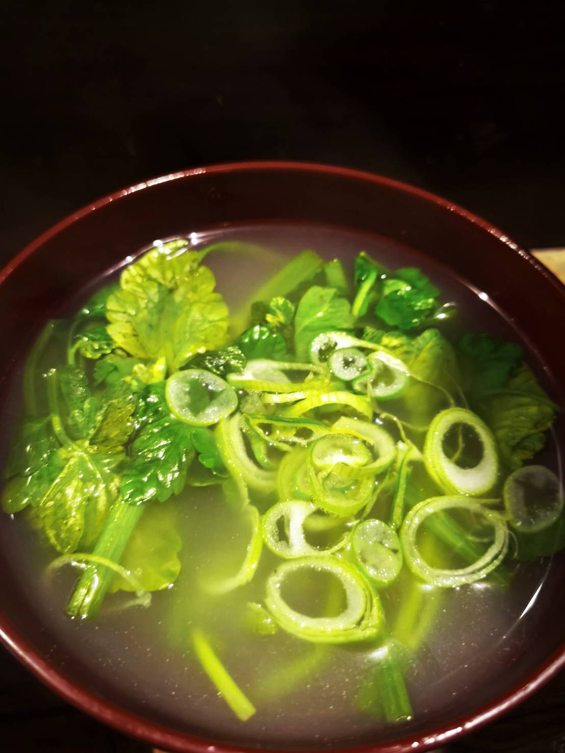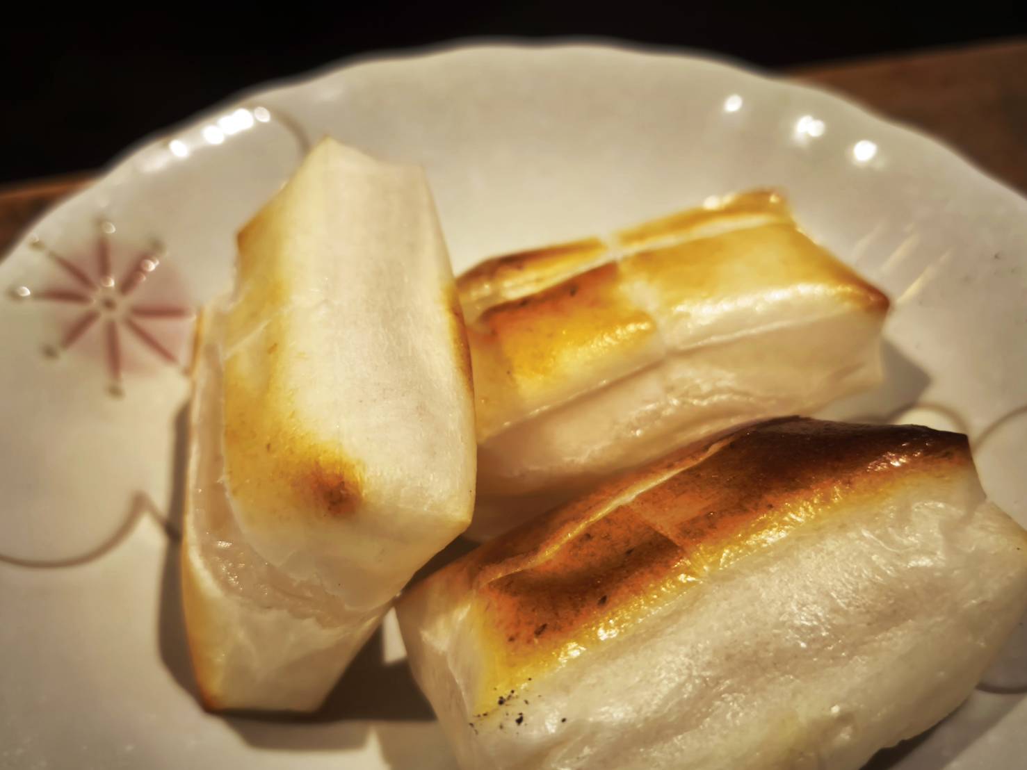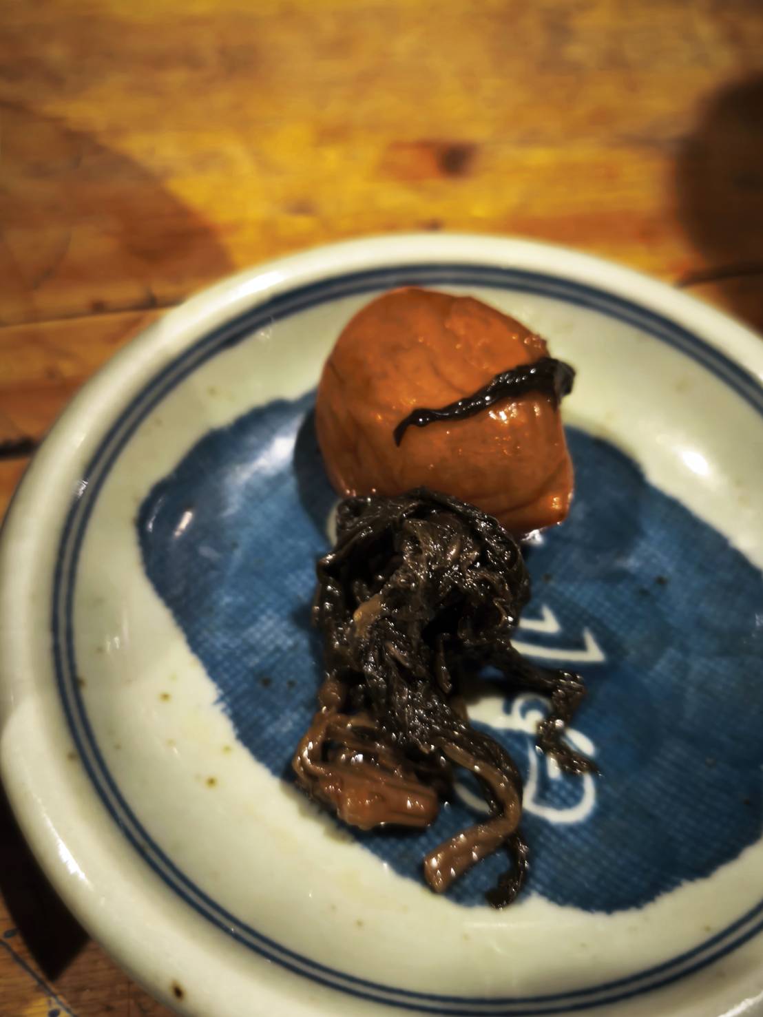 お通し鶏皮ポン酢お餅セリ梅干しお蕎麦