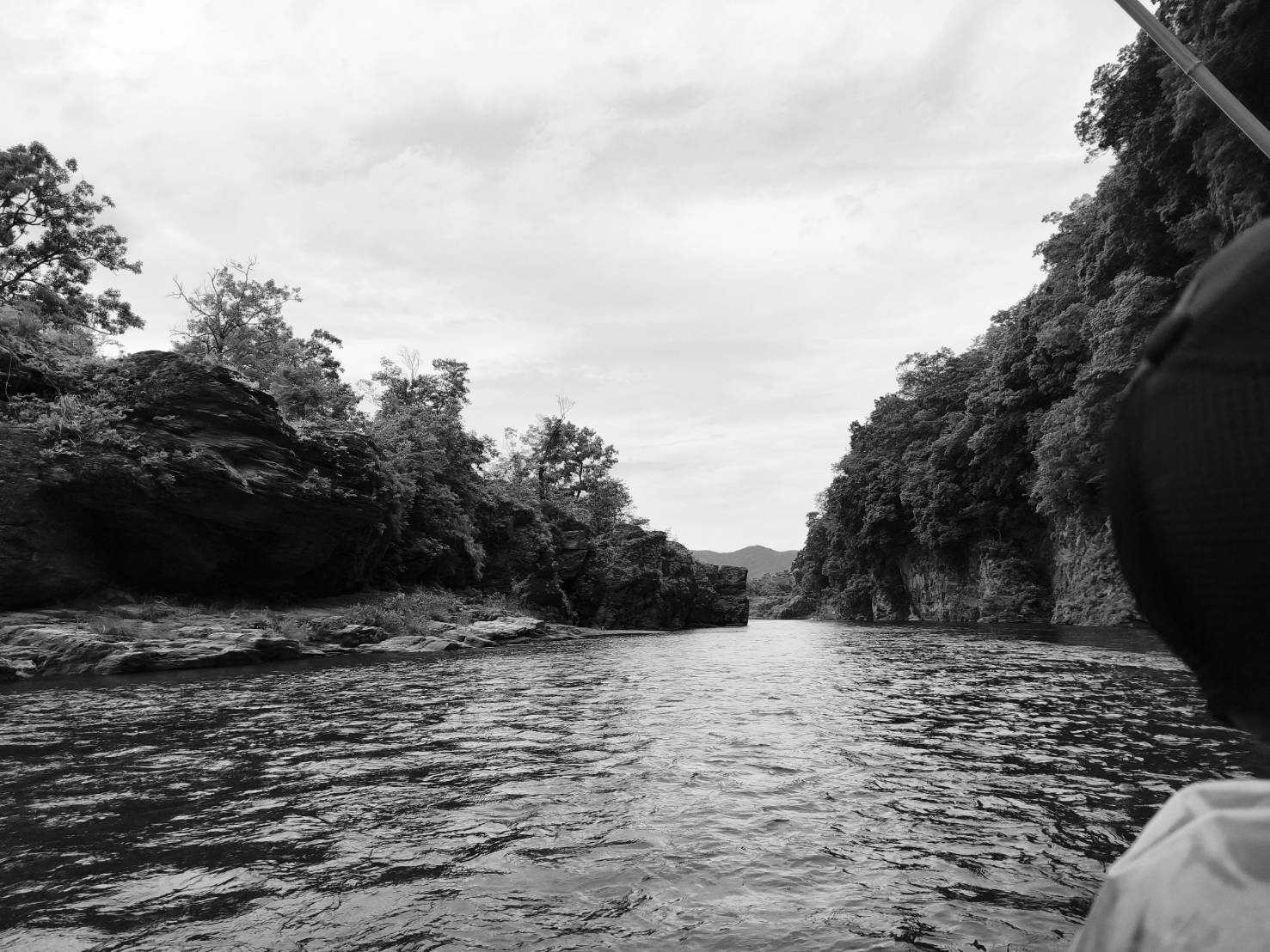 川下っていくと流れの速い所や高低差のあるところは揺れたり水がかかる。(水がかからないようにシートがある)
