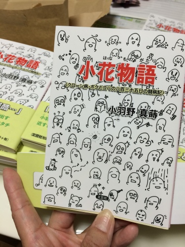 こんばんは小花物語へようこそお久しぶりでございますほんとうにホントウニご無沙汰いたしておりました。その間に出版の準備が着々と進んでおりました。ついに発売日が7月1日でございます只今、予約受付中~全国どこの書店でも予約可能ネットでの予約もできるところもあります。ぜひぜひご覧になってくださいませねここで一つついさっき気づいたんですけど・・・砕け散ったコハさんの夢・・・実はコハさん小学生の頃夢を語っておりましたコハ自身はおぼえていないコトだったんですがワタクシがおぼえておりましたそれは『30歳までに本を出す』ことでした~わぁ~お先日6月19日はコハさんの30歳の誕生日誕生日プレゼントはもちろん『小花物語』http://www.amazon.co.jp/%E5%B0%8F%E8%8A%B1%E7%89%A9%E8%AA%9E%E3%80%80%EF%BC%9C%E3%82%AF%E3%83%AD%E3%83%BC%E3%83%B3%E7%97%85%E3%83%BB%E3%83%9C%E3%82%AF%E3%81%A8%E3%82%B3%E3%83%8F%E3%81%AE%E5%85%AB%E7%99%BE%E4%B8%89%E5%8D%81%E4%BA%94%E6%97%A5%E3%81%AE%E9%97%98%E7%97%85%E8%A8%98%EF%BC%9E-%E5%B0%8F%E7%BE%BD%E9%87%8E%E3%80%80%E7%9C%9F%E8%92%94/dp/4286163849/ref=sr_1_1?s=books&ie=UTF8&qid=1435243740&sr=1-1&keywords=%E5%B0%8F%E8%8A%B1%E7%89%A9%E8%AA%9Eイラストはコハですよそしてワタクシはペンネーム:小羽野 真蒔(こはのまま)です。ウフフどうぞよろしくお願い申し上げます。で、でね気づいたんです。コハはママを使ってちゃんと30歳までに本を出版したんだってことに夢って実現するのね~って実感!!声に出して何度も言ってたからなぁたとえコハがおぼえていなくてもそしてママも忘れていたとしてもですよ。すごいですね~表紙のイラストこのブログの読者のみなさまはもうお分かりですよね小花さんです。人工肛門のパウチ交換の度にコハが油性ペンで書き込んでひとことふたことしゃべらせていた例の小花さんです画像記録から描き起こしコラージュしてデータ化タイトルを載せてペンネームも考えて・・・出版社の方々にもいっぱいいっぱいお世話になってやっとやっと出来上がった本です。クローン病や潰瘍性大腸炎の患者さまとそのご家族の方に届いたらいいなって思ってます。そして「ひとりじゃないよ」ってメッセージが届きますようにそしてそして治らないっていわれても鵜呑みにしないでって治りたいって思ったら言葉にしましょう言葉にしたことは実現しますからいっしょに頑張りましょうね。。。おとななふんいき(笑)新聞広告も出ます!!配本書店↓↓おちかくのみなさま見つけたらおしえてね~ではではオヤスミナサイマセヨイユメヲ