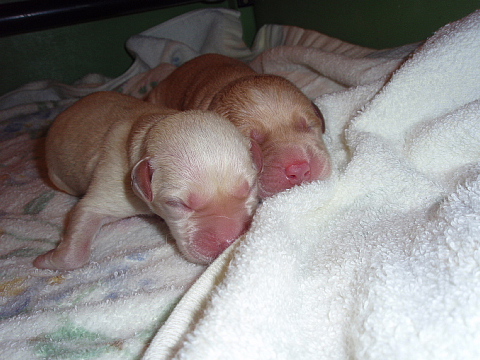 小さく産まれたベビーたちですが、あり余るおっぱいをたくさん飲んでぐんぐん大きくなってます。とはいえ、大きさの差はなかなか縮まらず・・・名前ももめた結果、はじめは「タロー」と「ジロー」。次に「チビ」と「デブ」になり、「デブ」はちょっとかわいそうということで「プー」に!はい、長男が「チビ」で二男が「プー」になりました。どうぞよろしくお願いします。チビちゃんは寝るのが大好き。泣いていても抱っこするとすぐに寝ちゃいますZzz~プーちゃんはおっぱいが大好き!そして産箱の中をハイハイしながら探検しています今朝、そろそろ目があきそうかな?と思ってプーちゃんを見ると開きそうで開いてない。確実にチビちゃんの方が遅いと思ったけど念のためにみていると・・・なんと目頭の方がちょっとだけ開いてました。不思議なものですね~チビちゃんの体重は720g、プーちゃんは1144gでその差は歴然生命の神秘ですケリーはというと最初の1週間こそまめに子育てをしていましたが、今はいつものようにポイントをおさえて手抜き仔育てになりました。それでもちょっとだけ気がとがめるのか、産箱の中にせっせとおもちゃを運んでベビーのそばに置いてます。せめてもの母心かしら