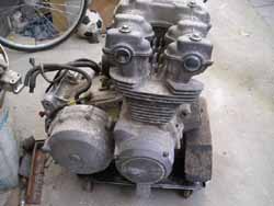 こんばんわ。今日もタイガースが勝って一人祝杯しています。今日は仕事の合間合間にCB750Fb実働確認エンジンを解体していきます。コヤツが本日の素材です。他にも左がCB750Fc、CB750Fz・・・これはそのまま売ります。こちらはCB1100Rcに載ってたごちゃ混ぜに組み立てただろうRcエンジンです。南アフリカで組まれたようですが・・・とりあえず、作業を進めます。まずはヘッドカバーを外します。次にカムホルダーを外すのですがいきなりトラブル発生。ネジの1本が外れない。無理から捻ったらバネの様な母材がくっ付いてきました。もう一度組み直して見ましたら問題無さそうです。カムとチェーンを外した所です。カムチェーンガイドボルトをケース内に落とす(汗)。パーツピックアップ工具で拾い上げて事なきを得ます。 ヘッドを外しました。スターター系を外します。ここまで外したパーツ群です。ジェネレーターローターボルトを外すのですが、今回はエアツール無しでやりました。ボルトに工具をかけショックハンマーでインパクトをかけました。何度かやっても外れない。懇意にさせていただいている箕面のサニーサイド加田社長に正ネジか逆ネジかお尋ねいたしましたら正ネジでした。もう少し力を加えたらチェーンが巻き込まれていきました。もしや・・・不安が的中しました。画像で判断できるでしょうか?奥まった所の部分が破壊されてしまいました。手前の破片がそれです。割れた部分からクランクが垣間見えるのでした。気を取り直し、クラッチカバーを外します。ここで更なるトラブル発生!オイル抜き忘れてた!後の祭りです。辺りは血の海じゃなくオイルの海になりました(涙)。こぼれをちるオイルを拭き拭きしました。今度はクラッチバスケットを外します。今回は4つ爪特工が無かったのでタガネで外しました。プライマリードライブギア(上の画像右上のギア)に六角レンチをかけクラッチセンター(タガネで指してるシャフト)に引っ掛けロックとしました。今度はジェネレーターローターボルトを外しました(加田社長おおきに)。ローターは特工のロータープーラーが必要なのですが、毎度使ってるZ1のリアアクセルシャフトをねじ込んで外しました。どうもCBのリアアクセルシャフトでも同じのようですが・・・ピストンを取り外しました、が、ここでまたまたトラブル発生!ピストンピンサークリップ1つをクランクケース内に落としてしまいました。分解で良かった。組み立てだったら顔面蒼白です。今夜はこれだけで終了します。全工程3時間でした。