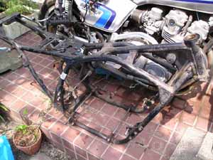 やっと勝ったね。おめでとう。昨日まで勝ったと思ったら連夜の逆転負け。今夜はおいしいビールです。更に阪急タイガース騒ぎ・・・30年以上愛し続ける者としては由々しき事態。村上ファンドのとっつぁん坊や、あなたは間違ってる!8日の黄砂は実に気分が悪い(今頃)。何だか息をするのも腹立たしい。路上で洗車してる人を何人か見ましたが・・・お気の毒です。あの黄砂が飛んできた地域が中国だと言うのが最も腹が立つ。インドやネパールからなら「遠路遥遥よ~来たな~」って労うが。黄砂の中に核実験で放射能帯びた物でも含まれてないか、実に心配だ。そんな事よりちょっと慌ててるのであります。今月初めにCB750F(z)を入手。少々の欠品はあるけど何とか再生できそう。キャブが完全固着。が、書類が無いのです。レストアしようと思ってたら、先週また1台買ってしまいました。う~ん、歩くスペースも無い。親しくお付き合いしているバイク屋さんから 「預かってるバイクぼちぼち持って帰ってくれない?」 1100刀、CB1100F、CB750Fを預かってもらってるのです。 「1台だけでもいいですか~?」 「何でもいいから持って帰れ」 「ちょっと待ってね~m(_ _)m」年末に、懇意にしている別のバイククラブの前会長さんから 「今度お店するねんけど、ディスプレイ用にレーサー無いか?」 前出の 「バイク屋さんに’88TZ250あるけど・・」 「あなたがレストアして下さい。」 「え~、いやや~」 「謝礼はするで~」 「承りました!」ある程度は終了しましたが、塗装がまだなのとスクリーンが無い!スクリーンが何処にも無いのです。焦ってると、「も~出来たか~」 「ま、まだです」 「はよしてや~」 「ハイ、頑張ります」本業でもないのにお尻に火が付いています。
