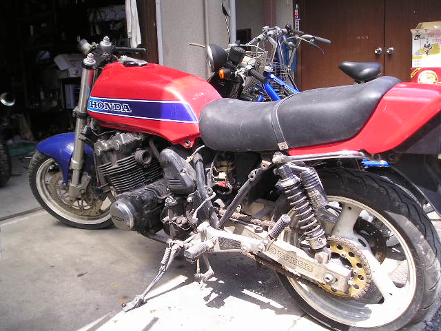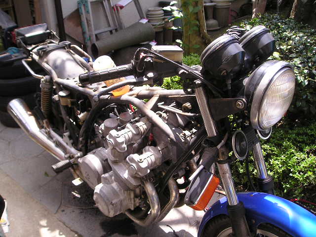 昨夜は今日のツーリングを楽しみにZ1にWAX掛け。出発時間まで雨が降ったり止んだりで急遽中止・・・何処までも運の無い私(涙)。でも、気を取り直し、CBをやっつけるぞ!って、10時から解体にかかりました。 11時過ぎに突然BMW-M3がやってきて、花銀杏:「やってますな~」。おいら:「お~、丁度え~とこ来た、エンジン降ろすの手伝って~」、てな訳で、すぐさま降ろしました。所用時間10分。昨夜作った台に載せて終了。暫し休憩と雑談でお昼過ぎ、M3が帰って行きました。花銀杏さん、ありがとうね。遅めの昼食後、今度は干餓死皮氏登場。おいら:「お~、これで作業がはかどるぜ~」干餓死皮:「何するの?」おいら:「午前中、花銀杏さんとFzのエンジン降ろした車体に、先日降ろしたボルドールのエンジン搭載して始動確認したいねん」で、載せてみました。こいつにFbのキャブがなかなか入らない?2メートルもある木材をテコにして放り込みました。実に手強かったのです(疲)。更にFzのマフラーは穴が開いてしまったので廃棄し、CB750Fb用のカーカーを付けて・・・???フランジの形状が違うので付かない!倉庫をゴソゴソ。ありました、Fb用フランジ。それを使って・・・ありゃりゃ??またまた付かない!と、いう事はFz、Fb、FcのEXフランジパイプは別物?ここで断念するわけには行かないので、CB1100F用カチアゲ加工(自作)カーカーの出動!ありゃ?750用に比べて随分重いぞ。フランジが鉄?パイプもゴツイ?・・・気にせずに続行。フランジカラーが細めの750用だったので、「ちょっと工夫でこの旨さ・・・神田川」・・・ちょっと工夫で付きました。 ガソリン送り込んで、セル数回、生き返りました。オイルが殆ど入っていなかったので軽くエンジン始動させて終了。今度はいつもの解体作業。2人でサクサクと解体作業はいつもの様に手際が良い。アッという間に全バラです。片付け作業もいつもやってる二人なのでアッという間でした。18時半、ZZR1100に乗って帰って行きました。干餓死皮さんありがとうございました。今夜はタイガース、対ジャイアンツ初勝利!終始気持ち良く観戦させて頂きました。日記書きながら一人祝杯しています!!!万歳!!!でも、何だか、虚しいのは何故?