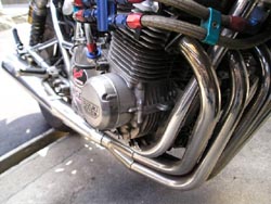 今日の夕食は家族でディナー。だから今日の更新は早めです。午前中は刀のマフラーを取り付け、午後からは箕面のカルフールに程近い場所にある、キャンピングカー専門店に行って来ました。そのお店でショックなお話を聞いてしまい、ちょっと落ち込んでます。この話はネタ切れの時にでも。刀にKファクトリーのチタンマフラーを付けた作業風景をば・・・。 外観はとっても綺麗なバンスのマフラー。総メッキされたフレームとメッキ管の相性は抜群でしょ後で、作業するのですが、サイレンサーの取り付けはちょっと変わってます。スイングアームがOVERさんの物を加工して取り付けているのですが、太いアームのお陰でサイレンサーはフレームの外側にカラーを差し込んで取り付けて有ります。普通に取り付けることを思えば3センチ以上オフセットですね。 サイレンサーの裏側は内部と外部、両側から腐食が激しく、もはや再生不能よく、車検取ってたね先ほど取り付けにはオフセットと書きましたが、写真2枚目、右側がマフラーに付属していたカラーです。本来は段付き側を取り付けボスに差し込むのですがオフセットを稼ぐのに逆に組みます。それでもアームに接触するので手頃なパイプをカッターで切り取りカラーにします。カラーを入れたので、付属のボルトでは届かない。巣窟(ガレージ)内から探したボルトは長すぎるのでカットして、ダイスで修正。付いた付いたそうそう、組む前に体重測定しました。バンス&ハインズ 鉄 約6KgKファクトリー チタン 約4Kg意外とドテチンも健闘してますな約2Kgの軽量化です。良い感じニンマリほくそえむのですエンジンかける時間が無かったのは残念!今度はスプロケの端数を再計算しなくちゃ。忘れちゃいかんので・・・・16丁ー41丁。