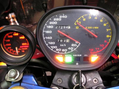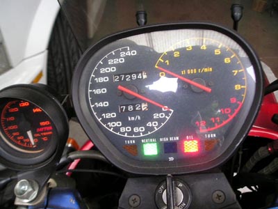 今度の日曜日は青山高原。今日ほどではないにせよ、お天気であって欲しいです。刀ミーティングがあるそうです。一体どれくらいの数が集まるのでしょう?今日も、刀の車検取得に向けて、点検作業続行。作業時間は30分。毎回、コンビニメンテだね。TM36の整備を終え、今日ガソリン流して見ました負圧コックゆえ、セルをしつこく回す。ヤベ~、新品のバッテリーが死にそうだぁ~ボアアップと圧縮が上がってる為、少しでもバッテリーが弱ると始動できなくなるのです。ボッ、ボッ、ボッ、ボゥ~轟音と共にお目覚め。良かった、良かったさて、懸案のオーバーフローは見事完治です撮影したら・・・・メーター内の照明切れてる?カワサキの左ハンドルスイッチに換装してあるのでハザードが使えます面倒だが、照明が点かない原因究明です。エンジンをかけたまま、フロントカウルを外して、メーター下部の配線を確認。何処もカプラー緩んでないけどな~、と、ゴソゴソしてたら・・・・点いた!ハァ~?どこかで断線?時間がないから、ここで終了。原因が判らんけど・・・・気が向いたら直したいけど、点いたままなので、何処が原因かはっきりしません。だから、電気嫌いなんだよ、おいら。刀のアニバにはポジションランプが有りませんが、おいらのはあるのです。右ハンドルスイッチボックスをヤマハOW01に換装したら、ポジションスイッチが有ります。折角、スイッチがあるのなら、使えるようにしましょう、って事で、刀のライト裏に穴開けてイエローバルブを突っ込みました。良いでしょライトは普通にホワイトバルブです、念の為。