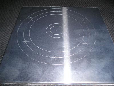 昨夜のT-G戦は凄かったね~。滅多に有りませんよ、あのドラマ浦安から弟が観戦しに甲子園まで来てたのです。それに味を占めたのか、今夜も行ってます。おいらも連れてけ~、コンニャロメ~!今日は仕事が終わった夕方、チョイノリ出動で、ホームセンターへ。思いのものがなかったので、時々使うものを数点買いました。やっぱり無駄遣いしちゃうね。チョイノリは相変わらず、30~40キロしか出ませんなぁ~。フラストレーションたまりまくり。オマケに35キロ付近からは速度警告等が点滅。そんな装備する前に、もう少しスピード出ませんか?刀のチェーンラインオフセットは10ミリから5ミリに変更する事に決定しましたが、パーツを作らなければならなくなりました。材料は、5ミリ厚のアルミ板を加工することにしました。ケガキ用のコンパスで、予定寸法にケガいて行きます。作業途中、分度器が無いことに気付いた。取りに行くのも面倒なのでコンパスだけで6穴箇所を決定しました。やり方、わからないですか?例えば、好きなサイズの円を書きます。コンパス開度は変えずに、先に書いた任意の円周上の一点から円を描くようにします。その時、先に書いた円周上との交点が開度60度の場所に当たります。その、交点から同じ作業を5回ほど繰り返せば、6つの交差点が出来るのです。で、出来たのがこれ。一番外の円がハブのサイズ。その内側がボルト穴です。更に内側で切り離しです。中央はホイールの一番外側に来るカラーの補正用を切り出すことにしました。カラーは接着剤でくっ付けちゃおう!って、事で御勘弁