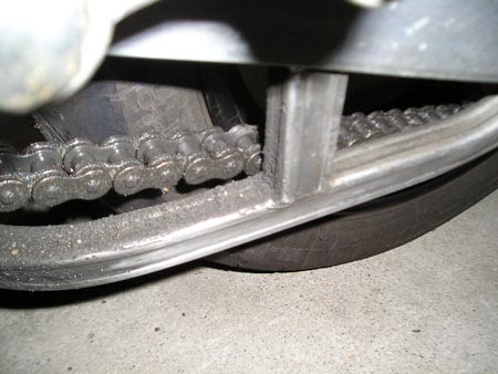 昨夜のD-T戦・・・・・えらい負け方してしまった。余裕ぶっこいてたのに・・・・今日は、刀のチェーンラインの変更に1時間も作業しちゃった昨日ゲットしたサンスタードライブスプロケット(オフセット0)を取り付けて様子を見ました。リア側は前の仕様と同じですが、オフセット用のスペーサーは外して有ります。チェーンがタイヤの縁にキッスしてます。やはりある程度のオフセットが必要です。ここで、あることに気付きました。オフセット用のスペーサーを外した為に左側に隙間が出来てしまいました。想定外でしたこの部分はあとで考えるとして・・・タイヤとチェーンの接触を避ける為に、ロックワッシャー(1ミリ厚)を3枚重ねて取り付けて様子をみました。リア側はノギス片手に約3ミリ左にずらしました。で、ホイールを回転させながら接触の有無を確認します。1~2ミリ離れているでしょうか。しかし、タイヤが新しいうちは大丈夫ですが、暫くすると、ある程度タイヤが膨張して接触するはずです。なので、オフセット値は5ミリに決定します。先ほど隙間が出来てしまったベアリングカラーは手力では抜けませんでした。またまた秘密兵器登場・・・・・何でも出てきますな、おいらの巣窟ベアリングプーラーで抜きます。足場に傷をつけたくないので、木片を敷いて有ります。抜き取ってPCの前でハイポーズ。下側が5ミリ長いものを製作しようか?それとも面倒だから5ミリ厚のカラーを作って差し込むか?こだわりと今後の作業性を考えると作り直すのがベスト。流石に旋盤やフライス盤は持って無いので・・・・・工夫しなければ・・・