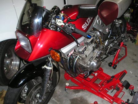 ジャカジャ~ン!昨日の答えの発表です。今日は午前中から、とっても寒かったです。その寒い中、宅配便が届きました。御開封・・・・・とうとうやってきました。。。でもね、何だか色が・・・ブラック注文したんだけどなぁ~。紺色に近いぞ?何か嬉しさ半減だぁ~ 今日は午後から、CB1100Rの部品の捜索活動に時間を割かれました。部品庫はアストロ君のお尻の方にあるので、アストロ君の移動から始めないといけないわけで。ジャァ~ン、発見!!!Zやカタナ、CB1100Fや750Fのパーツは一杯あるけど、Rのパーツは唯一つ。これの反対側の分です。フォーク組もうと思ったのですが、何だか部品点数少ないや?仕方が無いので箕面の専門店サニーサイドに向かうのですが、道中、お友達がカタナの大修理をしているので向かう事に。電話をしたら、「ハンドルとセンタースタンド持って来て~」だって。。。。現場は寒い青空メンテ。バレーボールチームが組める数、しかもオッサンばっかり暫く見てたら、野球チーム出来る数になりました。日没と寒さが襲ってきたので、撤収。お食事まで戴きました。おいしゅうございました結局、部品買いに来たのに、ハンドルとセンスタ差し上げに来たみたいですそのお店は、電話かけても・・・・どうも休んでたようです。。。。ざんねん。