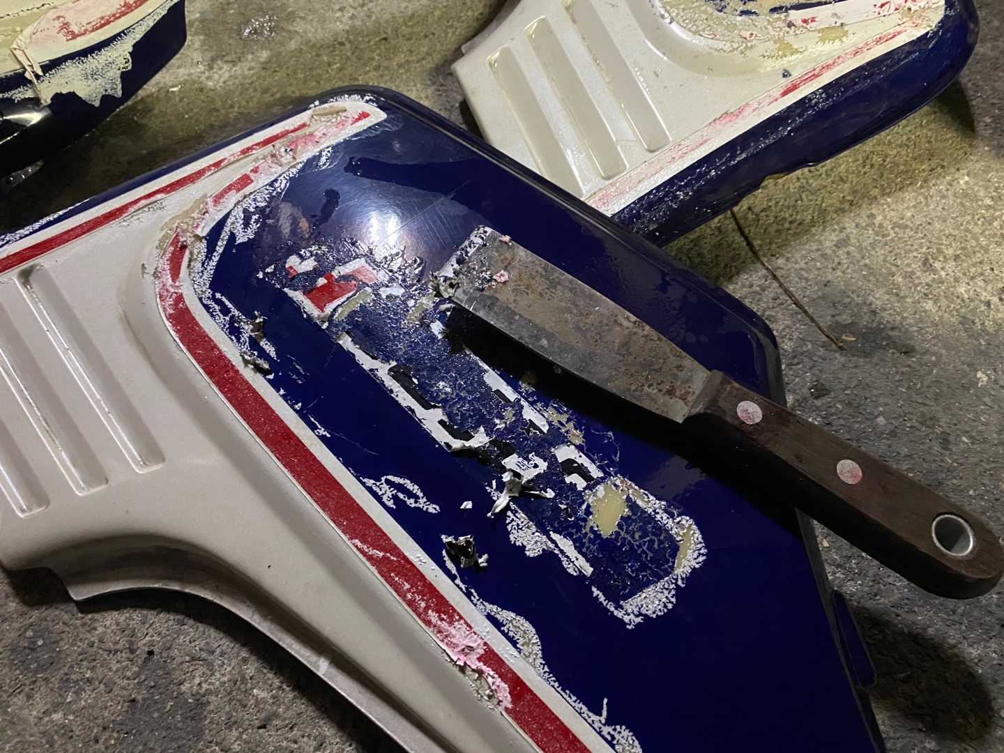 古いデカールだけ剥がして塗装の段差を研磨して均し、古い塗装の上から塗り足す(足付け)ことにします。
