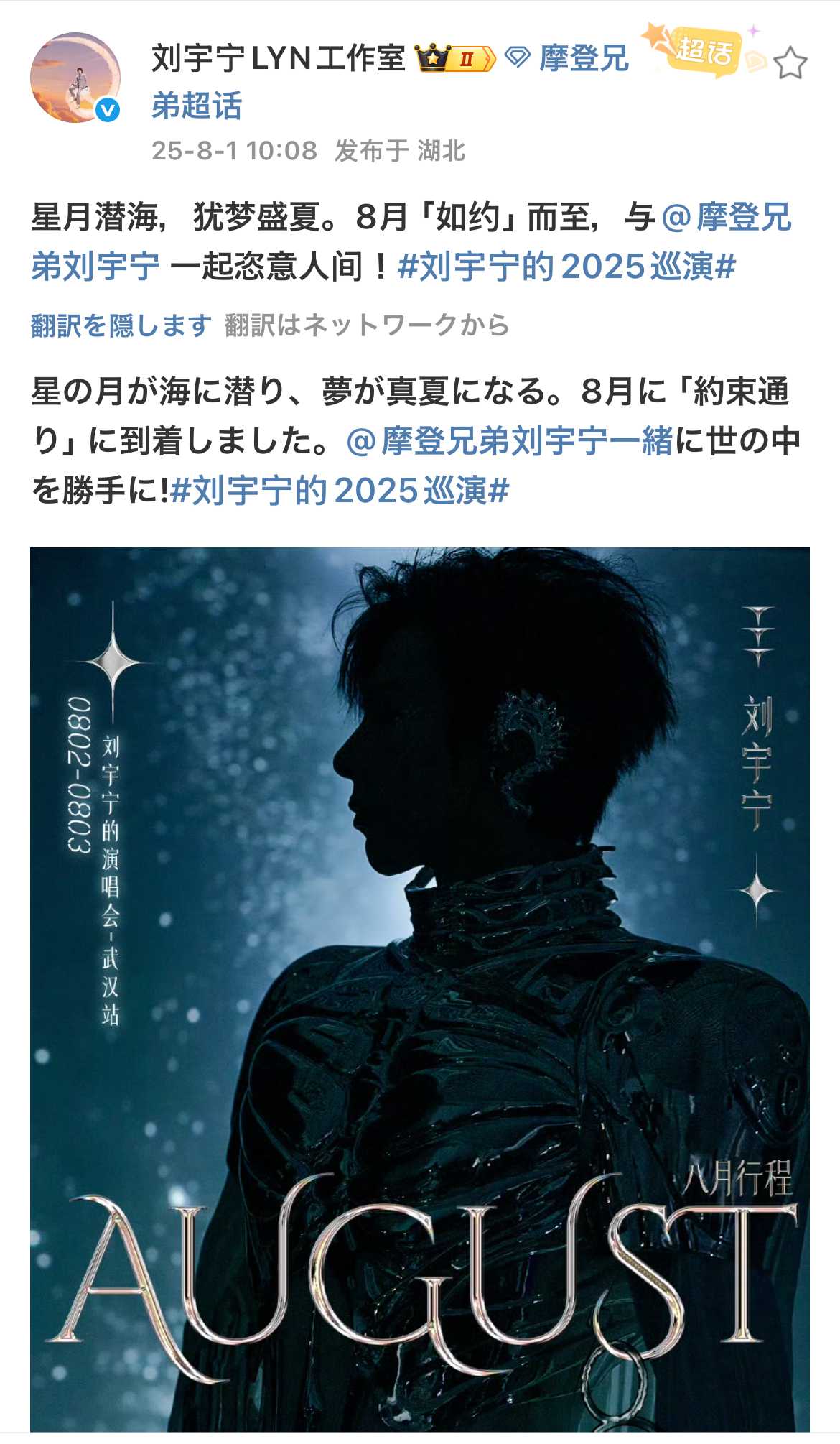 2025/09/01 刘宇宁 9月スケジュール 2025.09.01