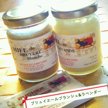 南仏の春から夏はお祭りシーズンらしく、先日ははちみつ祭りというのがあったらしい。そこで娘がい~っぱい試食して一番美味しかったもの2つを送ってくれました。どちらもペースト状の結晶タイプです。ラベンダーは安眠を促すハーブとしてお馴染みですが、はちみつはちょっと菩提樹に似てるかな。ブリュイエールブランシュは全く知らない香と味でした。花によって味も見た目も全然違うはちみつ、おもしろいです。