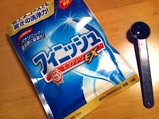 今やなくてはならなくなってしまった食器洗浄機。スピーディコース、初めの頃は使っていたけれど、だんだん落ちが悪くなってきて、最近は全く使っていなかった。けれども、モラタメ.netで「省エネのコースでも驚きの洗浄力を持つ食洗機専用洗剤~フィニッシュ エコクリーンEX」なるものをモラったので、久々にスピーディコースで洗ってみた。なんとなく綺麗になっている気がする。少なくともガラスのコップ(私は大体これを目安にしている)は合格。においもきつすぎず、いい感じ。ただ、付属の計量スプーンの形がパッケージのイラストと違うの気になった。イラスト通りの量だと、どう考えても少なすぎ。本製品にはちゃんとしたスプーンがついているのかな。