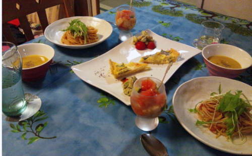 7月末に学校が修了し、2週間のサマースクールを経て昨日帰国しました。久々の家族3人で囲む食卓、なんやかんやとしゃべったしゃべった。毎週スカイプで話していたとはいえ、1ヶ月ほど前に会ったばかりとはいえ、知らないことがいっぱいあったんだなぁとしみじみ。娘はずっと呑気に楽しく暮らしているものと思っていたけれど、かな〜り辛い時期もあったようで、呑気だったのは実は私の方だったのでした。この先どうするかはまだ決まっていませんが、時間はたっぷりあるので、また一歩ずつ目指すところに近づいていけたらいいなと思います。今日の晩ごはん(ちょっと おフランス風)娘作フレッシュトマトのパスタ、白ネギのキッシュ、プチトマト、アボカドとジャガイモのサラダ、スイカとキュウリとごま豆腐のカクテル、かぼちゃのポタージュ