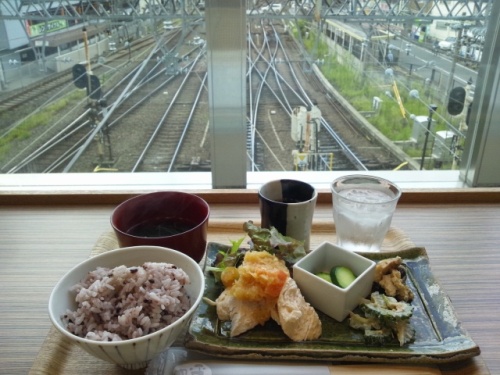 京都へ行く用事があったので、乗継ぎ駅である大和西大寺の駅ナカでランチをいただきました。最近増えている駅ナカ。便利ですね〜。改札を出なくていいのですから。この西大寺の駅ナカでは野菜まで売ってます。今日入ったお店は「幡いのうえ」カラダ想いランチ 800円。下を通る電車を見ながらいただきます。なかなか楽しいです。ただし、この窓の外がベランダみたいになっていて出られるようになっているので、大口あけて食べていると電車を見に出てきた人と目が合ったりします。おかずは鶏ムネ肉の酒蒸しおろしソースのせ、ゴーヤとシーチキンのマヨネーズ和え、厚揚げとなすのごまみそ和え、キュウリの浅漬け、雑穀米、おすまし。ムネ肉はちょ〜っとぱさついた感じ。そして、おろしソースの水気がゴーヤの方まで侵入してきて水っぽくなっちゃってるのが惜しい。盛り付けはかわいらしいのにね。ごはんはモチモチ。おすましははるさめとわかめ入りで香ばしく、スープって感じでした。お番茶も美味しかったです。大和茶かな?幡・イノウエ 近鉄大和西大寺駅店 (カフェ / 大和西大寺駅、平城駅)昼総合点★★★☆☆ 3.0