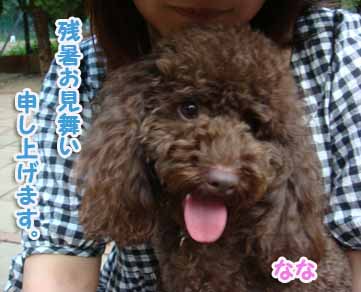 暑中お見舞い申し上げます。みなさま、暑いですね~。もう口癖です。でも店長はがんばってます。膝に 看板犬ななと ひえひえジェルマットを載せて、今日もお仕事。こんな可愛いものをみつけると、もううれしくて暑さも忘れそう(なわけない) です。話が変わりますが、うちの 1わん、 ななですが、 食が細くてこの夏の暑さが心配でした。それで、スタミナがつきそうなおやつを見つけました好みにうるさい彼女ですが、これはもう大喜びで笑顔で食べてます。そんなささやかな幸せがうれしい店長なのでした。皆様も皆様のわんこちゃん にゃんこちゃんたちも夏バテに気をつけてくださいねななはスタミナ付けて、次のデートにいくそうです。