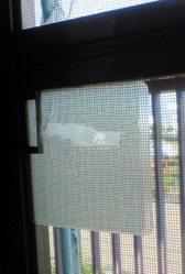 網戸の破れている場所の修理。でも修理用のシールをそのまま1枚貼ってしまった。説明書には「破れた個所に合わせて シールを切って使ってください。」他にも破れていた場所があったのに・・・。また、買ってきて修理しないと。夏も近いから。