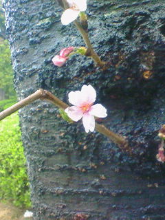 今年初めての桜です。咲いている数も少なかったのですが、雨だったので、早くも散っていました。