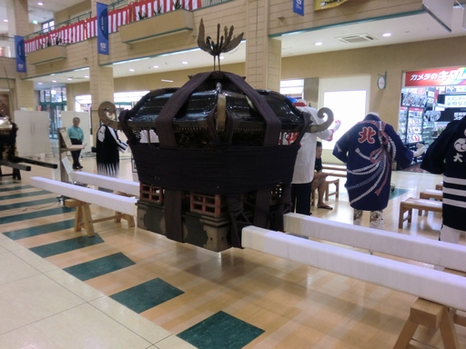 『お祭りだー!』・・・といってもお休みがある訳でもない。今日は各地域からお神輿が出たらしい。 そのお神輿が数日前からスーパーに展示されていたのを、友達が撮影していた。それを掲載させて貰いましたが、ニュースではお神輿が激しくぶつかり会う「鉢合わせ」で怪我人が出たそうだ・・・。子供達も見ていただろうから、安全第一を考えて欲しいな・・・。