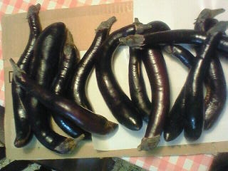 今日の朝、御近所の方が持ってきてました。「曲がっていますが良かったら・・・」と。茄子(ナス)です。写真は貰った物の一部です。前も頂いたのに・・・。貰ってばかりの状態。ありがとうございます。