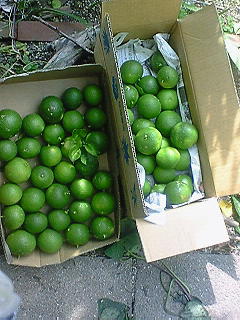 我が家の庭にあるカボスの木からカボスを収穫しました。今年は一度収穫したんですが、まだまだ出来ているんです。今日、収穫の途中です。小さいのもありますが・・・。そして一応は終わりです。箱一杯になりました。まだまだカボスの木にはカボスが出来ているんですが・・下の写真の通りに『鋭いトゲ』(赤い枠)があるんです。写真はボケていますが、鋭くて刺さると痛いんですよ。いろんな料理にかけたり、お風呂に入れる時もありますね。