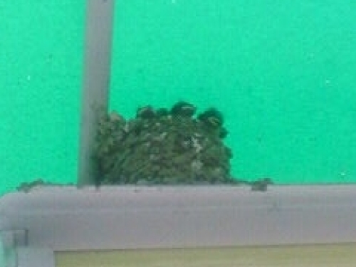 ある店の店先です。ツバメの巣があってヒナたちが鳴いていました。見えにくいでしょうけど・・・親鳥はヒナにエサを与えるのに大忙しのようでしたが。お店の人が【巣からフンが落ちないように】と設置した箱が壊れていて地面には・・・。巣立ちまではガマンかな?ここは毎年の様に出来るそうです。でも、今年は来るのが遅れたので「心配していたんですよ」との事。猫よけの「忌避剤」も設置されていました。天然記念物の「トキ」じゃないけど、暖かく見守りたいですね。