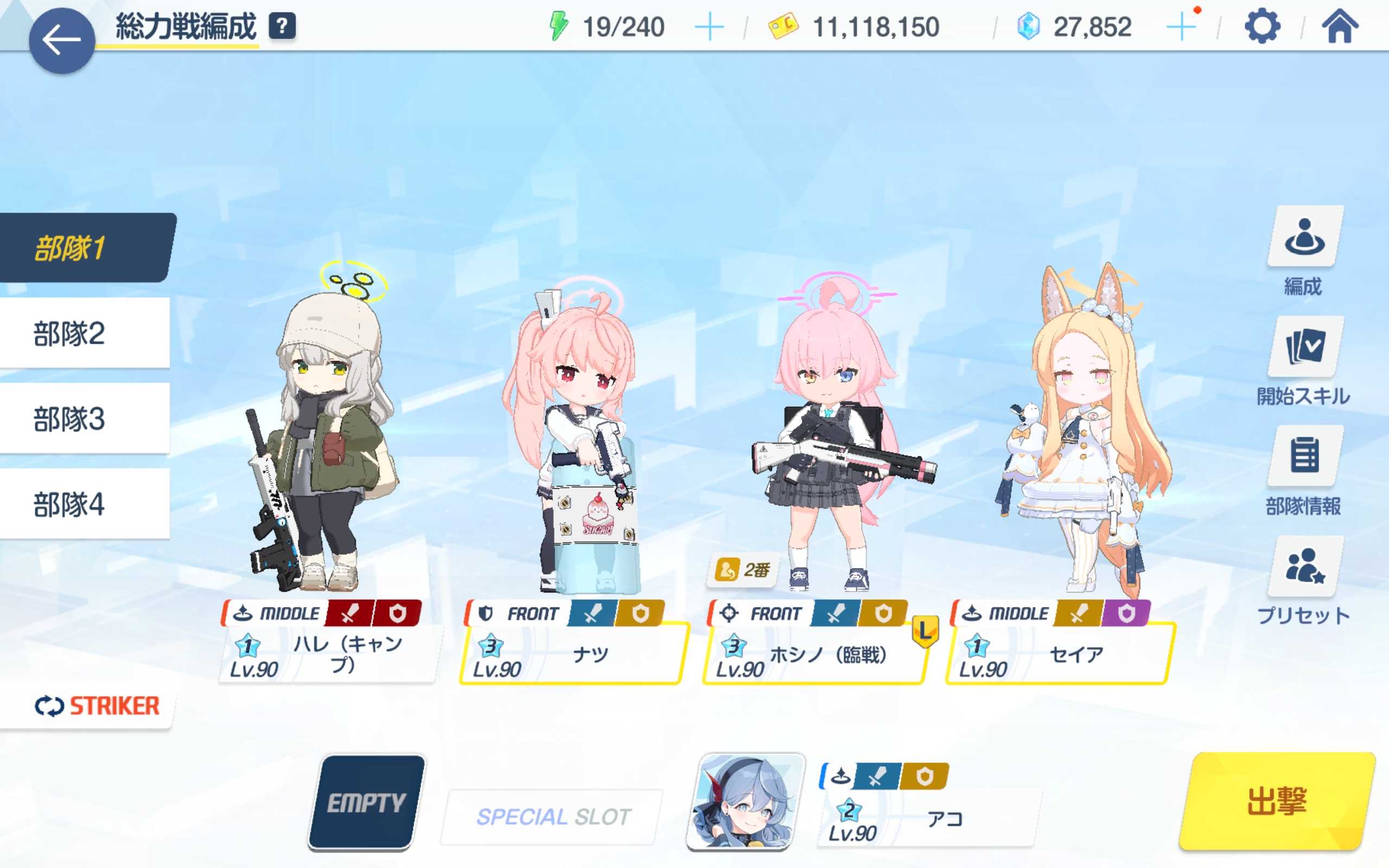 ・総力戦と大決戦において、おそらく上の難易度ができると、自分はこれだけ強くなれたのだな、と思えるのだろう。着任して90週間も経つが、INSまでのクリアばかりで、足踏みをしていた。ビナーですらINSまでしか倒せなかったのだ。だがようやく成し遂げた。TORMENT、3凸であるがクリアした。3凸なので、トロフィー帯はゴールド帯であろう。それでも、嬉しかった。無理やり臨戦ホシノや水着ハナコを固有3まで強化したりと、強行突破のため、無茶な資源の使い方もした。とりあえず。何とかなって、良かった。ブルーアーカイブ The Animation 第1巻【Blu-ray】 [ ブルーアーカイブ ]ブルーアーカイブ The Animation 第2巻【Blu-ray】 [ ブルーアーカイブ ]WX25-CP1 ウィクロスTCG ブースターパック ブルーアーカイブ SELECTOR DP-BOX | タカラトミー ウィクロス WIXOSS カード ボックス BOXブルーアーカイブ The Animation 第4巻【Blu-ray】 [ ブルーアーカイブ ]F:NEX 『ブルーアーカイブ -Blue Archive-』 カヨコ(正月) 1/7スケールフィギュア 【AMU-FNX1150】 (塗装済完成品フィギュア)1/6 『ブルーアーカイブ -Blue Archive-』 ヒナタ(水着) (塗装済み完成品フィギュア)新品カード Reバース for you ブースターパック ブルーアーカイブ BOXブルーアーカイブ マリー(体操服)メモリアルロビーVer. 1/7 完成品フィギュア(再販)[プラム]《発売済・在庫品》