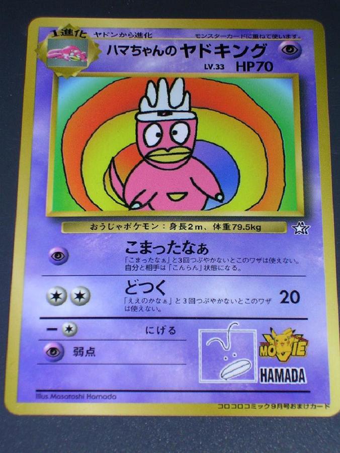 大掃除をしました。普通は年末にするらしいのですが管理人に普通の2文字は通用しません。いや・・・させません!!面倒くさい事は極力避けたいのですが謝礼付きという理由で参加しました。。。んで封印された部屋を開けると懐かしいモノばっかりでwww戦隊モノのおもちゃの銃とかwwwフィギィアとかwww中でも思い出深いのは・・・ポケモンカード!!もぅね・・・懐かしすぎて号泣寸前ですよwwwちょっと画質悪いけどこんなのとか超レアカードのこいつらとかwwwポケモンの青とかも出てきて懐かしい思いでいっぱいなんですが・・・・ふとポケモンカードのレア用のバインダーを開けると・・・・・神降臨!!まさしく神KING OF 神神の中の神これです。やばいやばい・・・ハマちゃんが居た~~~♪♪やっほぉ~~~♪♪やっぱり管理人は幼少からダウンタウン信者だったようですwww全体像はこちら技名が「こまったなぁ」と「どつく」ですよ???wwwやっぱりダウンタウンはええなぁ~~www皆様もたまには大掃除でもいかがでしょうか???貯めれば貯めた分だけ苦労はしますが思い出も多いハズ・・・です。このヤドキングは一生の宝物ですわwww余談ですがさっき楽天で売れそうな特別カードの値段を見ると3000~16000までと高値ばかりついてました・・・・ハマちゃんのヤドキング以外売ろうかなぁwww
