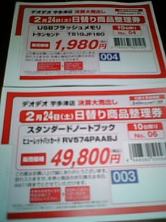 この前と、いうか先週5万円のノ-パソを買いそびれて後悔していた管理人刹那主義6号改です。んで今日8:50起床目の前にあったチラシをとってみてみるとノートPC=49800円午前9時より整理券配布急ぎましたよそりゃあもうえぇんで獲得!!みよ努力の証を!!ふ~良い買い物だったはず。