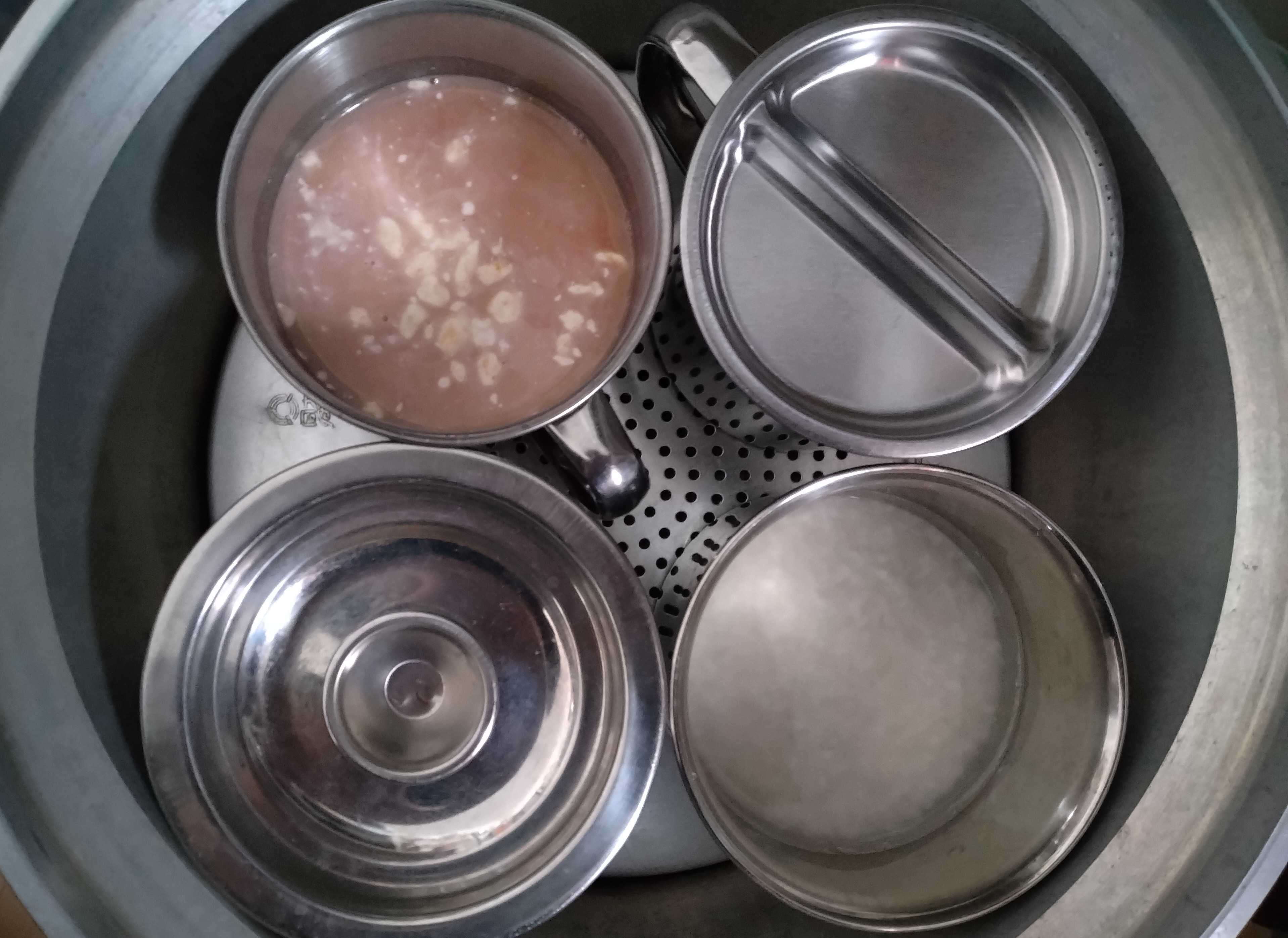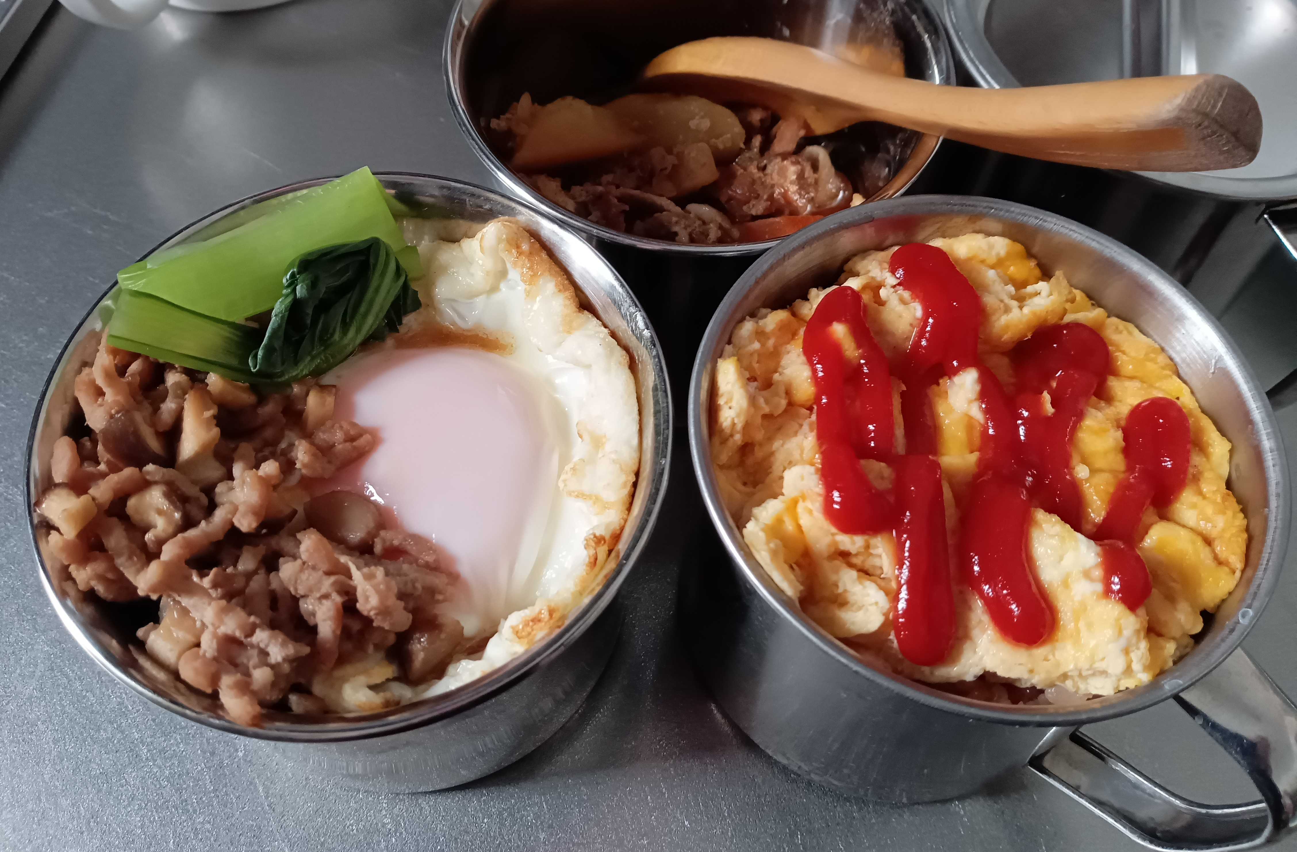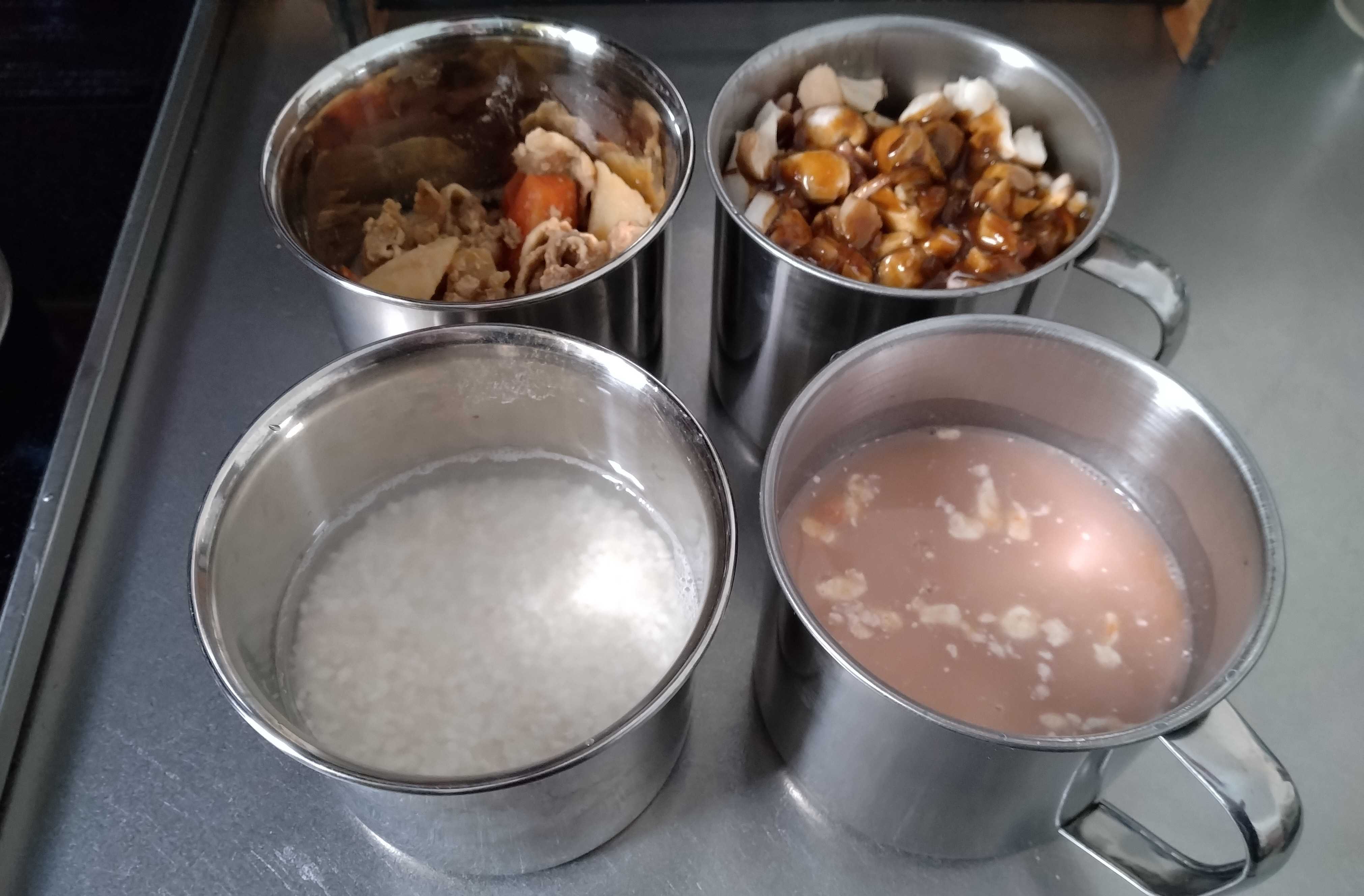 盅頭飯の容器には白米(米3/4合、お水140cc)。子供が心を込めて作ってくれた生煮えの肉じゃが。​​ ​​​​