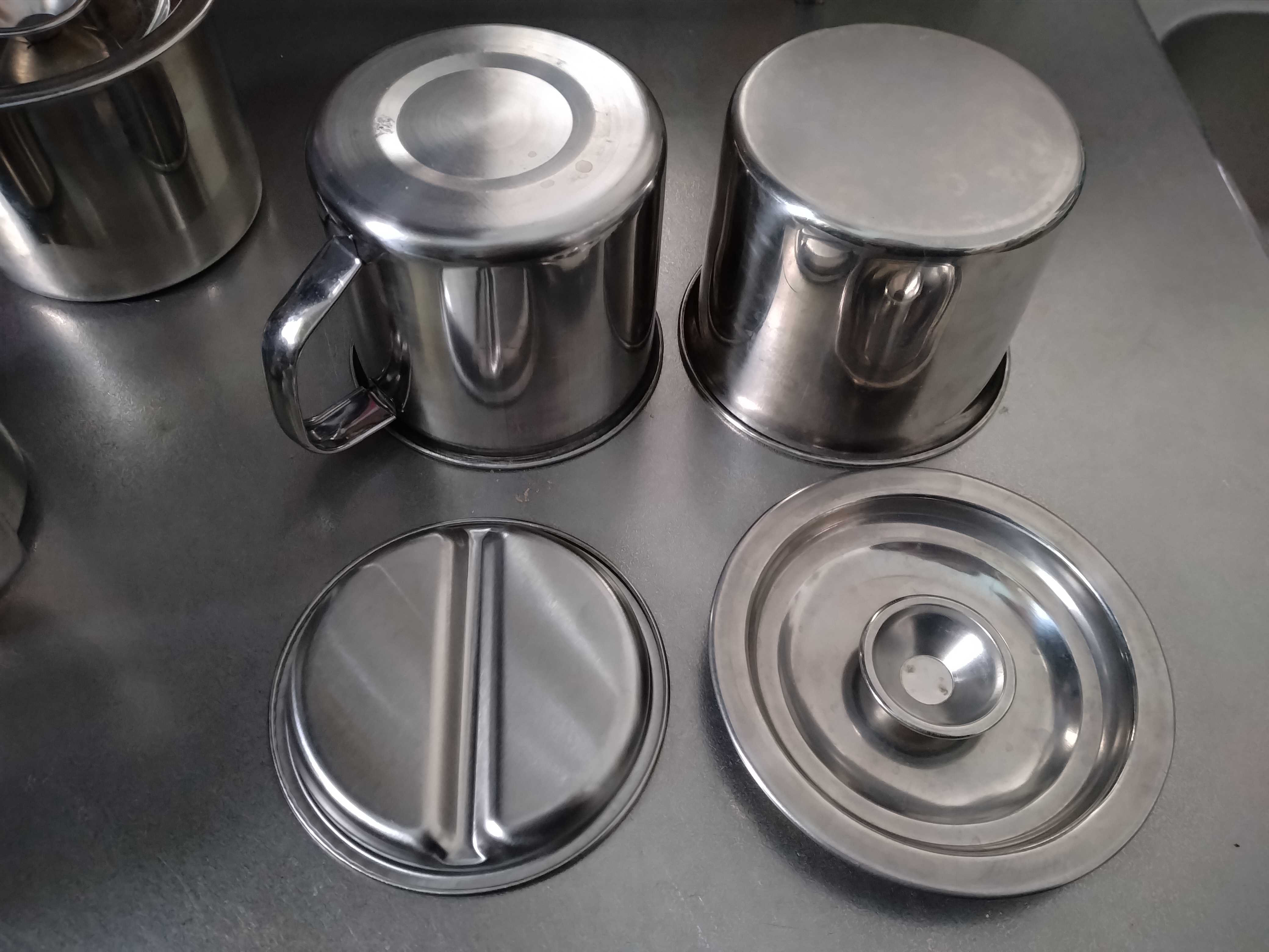 手前がセリアのステンレスマグ(430ml)と、蓋代わりの仕切り皿(9cm)です。