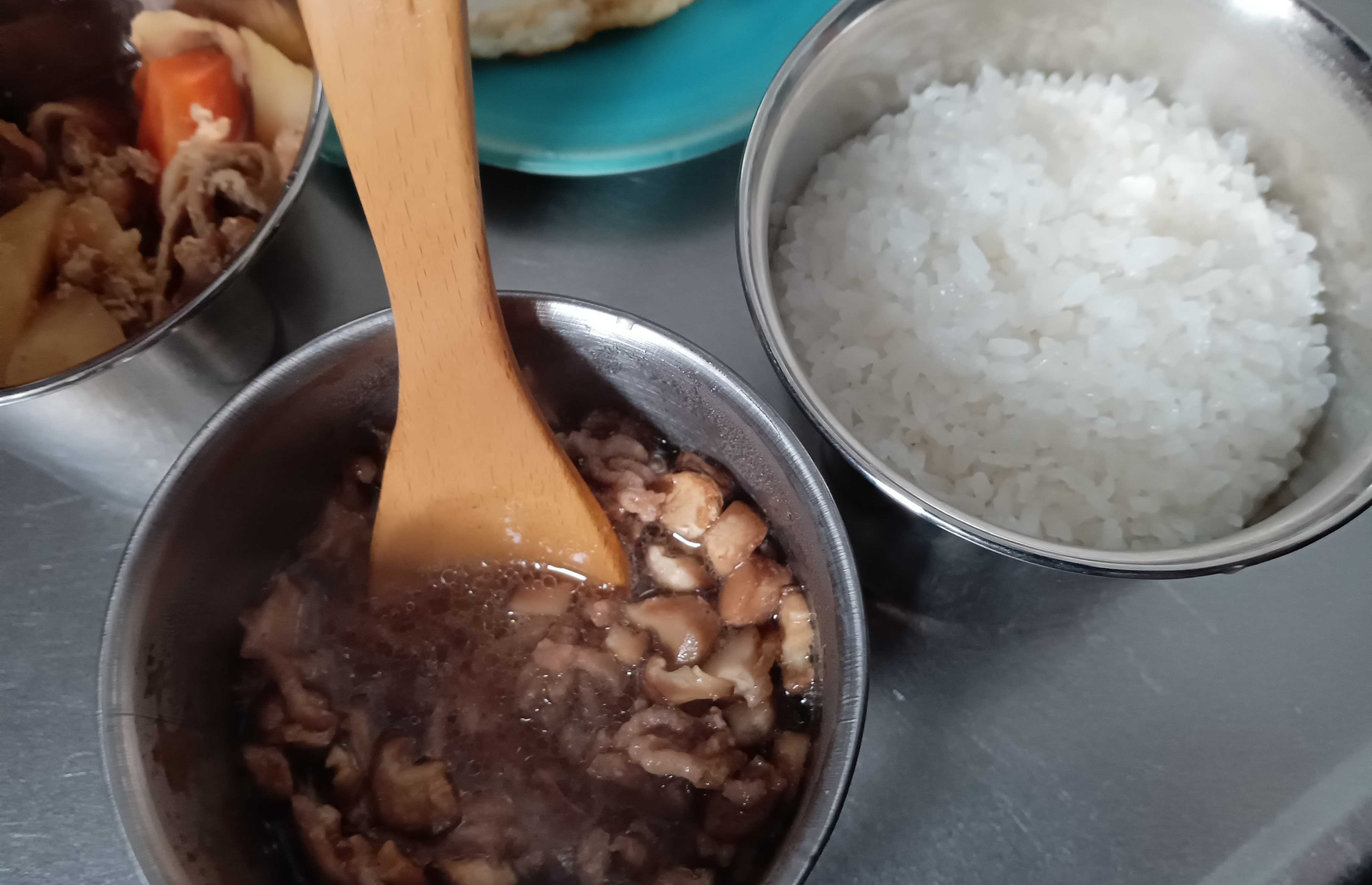 魯肉を白米にかけ、目玉焼きとオムレツを焼いてそれぞれにON。春休み(インターの春休みは長い)のランチいっちょ上がり。魯肉は多めにできたので、このまま小皿で蓋をして冷蔵庫に入れて置きます。