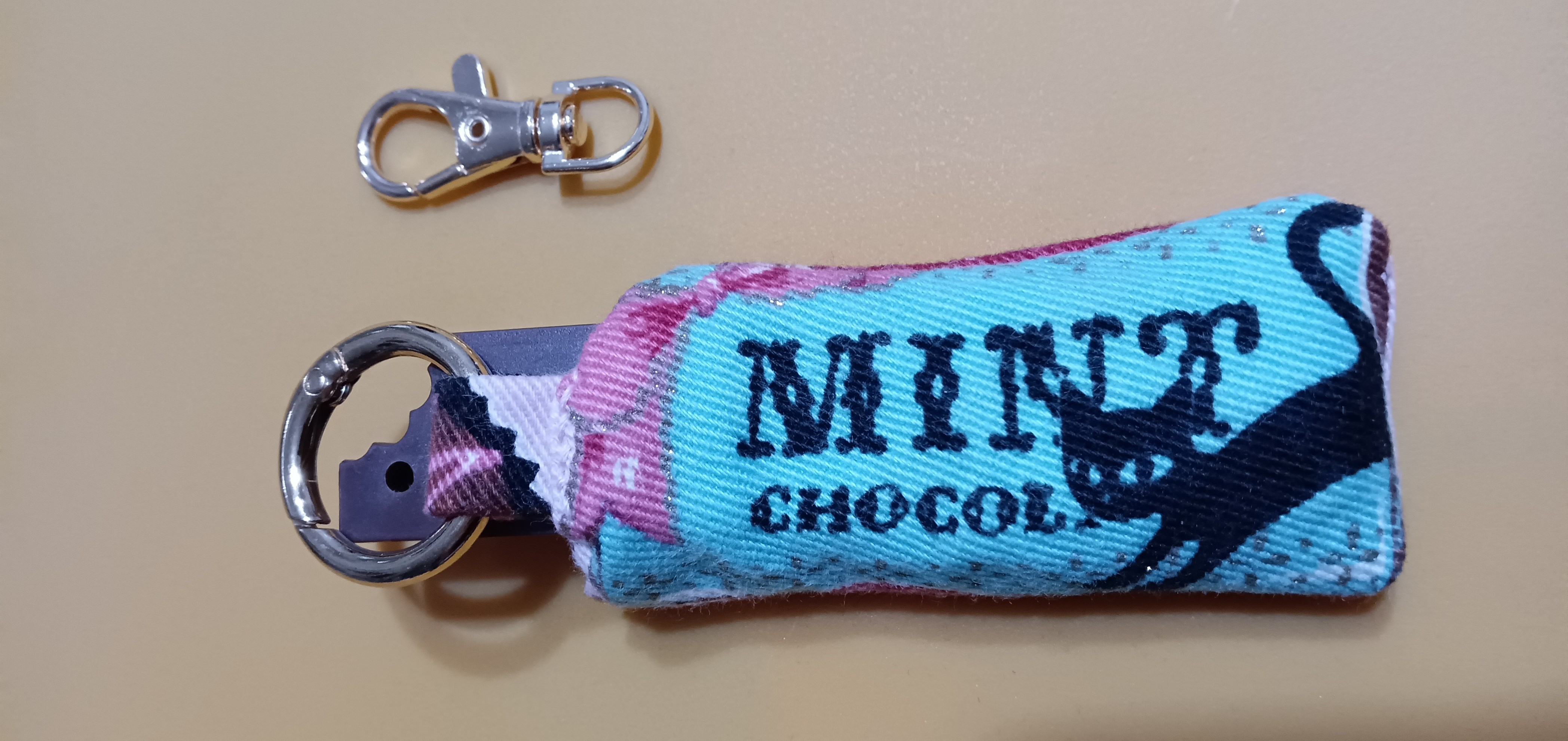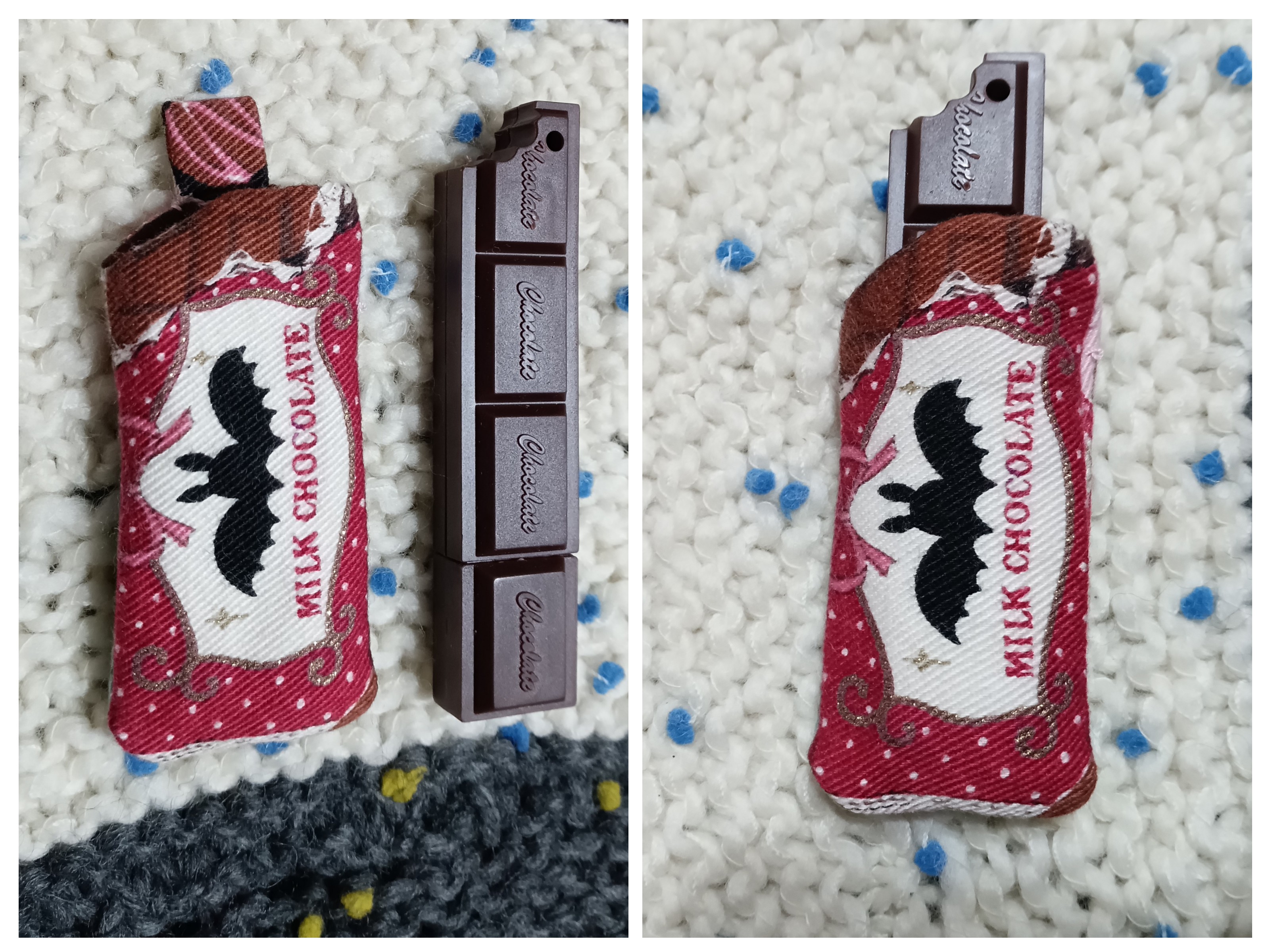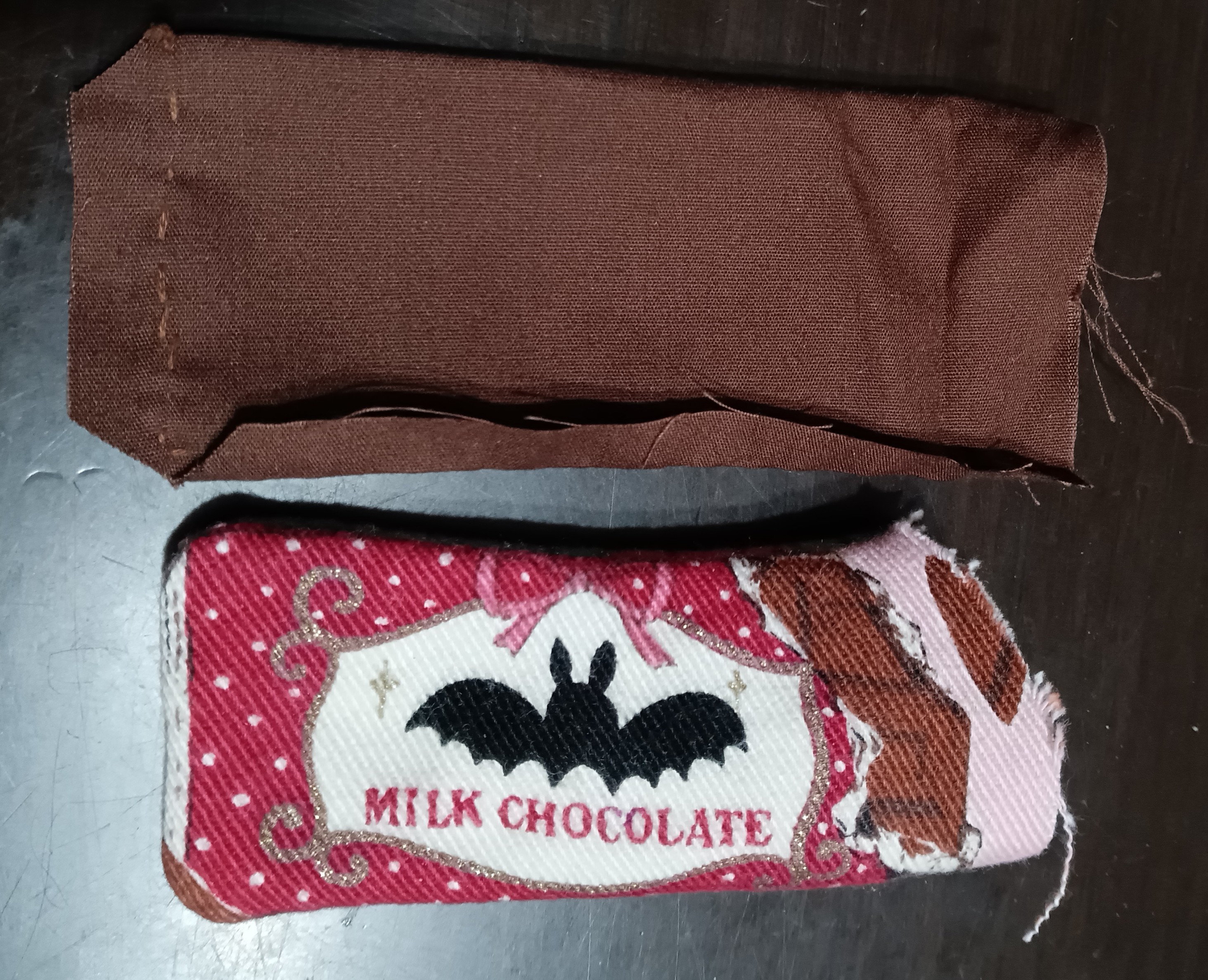 私の場合は、モチーフの形通りに縫って丁度でしたが、あまりブカブカにならない様にした方がよいです。ちなみにモチーフの大きさは4cm×8cm。端が斜めのモチーフなので、8cmは一番長いところ。他の生地で作る時は4×8に縫い代を適宜とって断ったら良いですね。裏地には木綿のチョコ色生地。