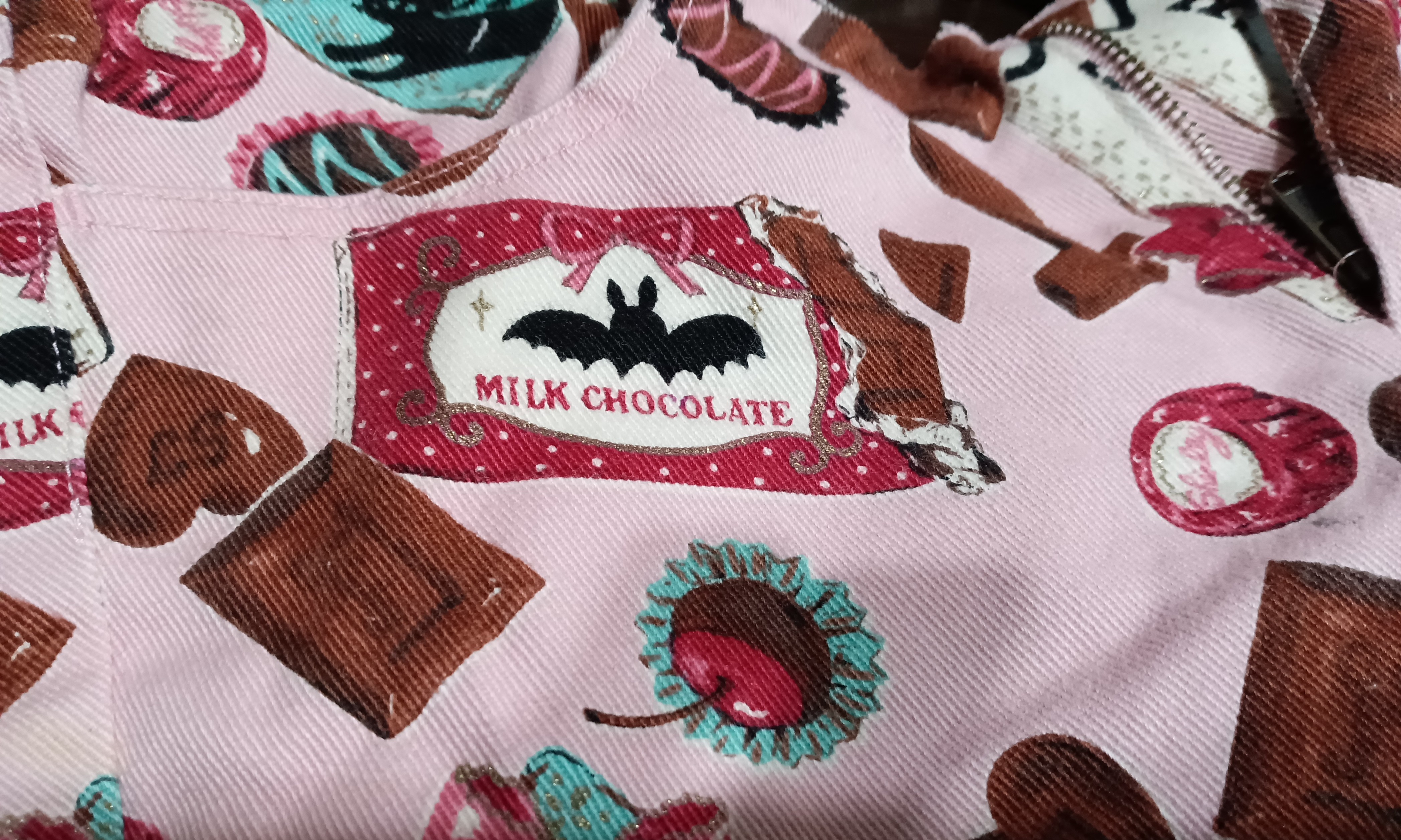 娘のサイズアウトしたパンツに良いサイズのチョコモチーフがあったので、これを使ってみます。デニム生地です。布選びでイメージが調整しやすいと思います。あえてチョコ感消すのもアリだし。
