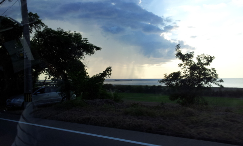 みなさまこんにちわ台風のフェーン現象がありここ2、3日蒸し暑かったのですが、今日は涼しいですそんな先日、車に乗っていたら自宅から車で1時間30分ほどかかる隣の市にいる旦那から「雨降ってきたけど、そっちは??(この日は我が家の新築屋根工事が予定されていました)」と連絡が入りました「降ってないよ」と返事をし、旦那のいる隣市の空を見てみると・・・すごい・・・初めて見ました。こちらは降ってない雨が向こうの雲は雨を降らせていましたこんな風に雨を見たのは初めてでした写真載せてみましたがわかりますかそれではまた