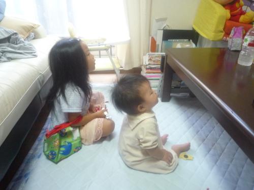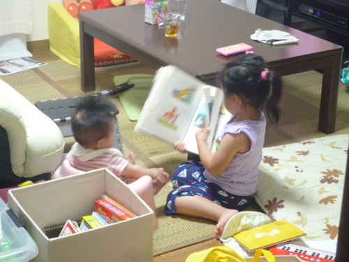 今日は娘二人が遊んでいるところをコソ撮りしてみました字の読めないお姉ちゃん(三歳三ヶ月)が言葉のわからない妹ちゃん(八ヶ月)が、不思議と絵本を語り&聞くという・・・笑おっかしくて写真を撮っていたんです・・・すると・・・『つうぅ~か、この人何してるんですか??』といわんばかりの表情にまた笑わせてもらいましたそれではまた