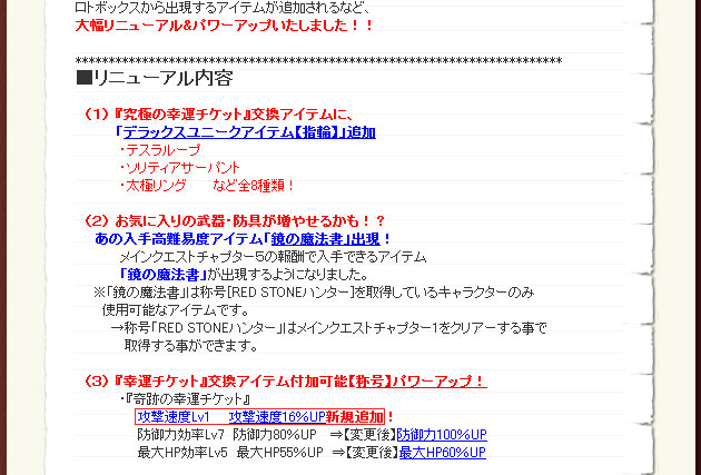 昨日のメンテが終わったあと公式みたらロトリニューアルのお知らせが!鎧チケに速度はつくのもさることながら、鏡の魔法書熱いですねーOPごとアイテムをコピーできちゃうという・・・装備強化が楽になる反面、プレイヤー間の装備に差がなくなって古参プレイヤーが不利になりそうな予感。とはいえ、成功率は34.2%固定(?)らしいので、そこまでひょいひょい複製できるようなもんでもないみたいですけど。とりあえず給料日も近いので、ダメオンの策略にハマってやろうかと思います!鏡出たら複製レポでもしようかなーさて、SS整理してたらドロップのSSがちょっと貯まってたのでたまには晒してみます。10月12日~10月23日の間のドロップ。狩り時間の割に数は落ちてるんだけど質がwwwww速度手もうち2つは補正30%↓でした。そろそろ社員きゃきゃみたいにフォムガとかバターとか来てもいいんじゃないかな?かな?明日から休みなので、ドリーム抱きながら狩りにいそしもうと思います!んでは(・∀・)ノシ