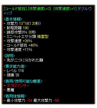ちょいとスキマ時間ができたので手短にこーしん!例によってSSはございません(;^ω^)先週の土曜日に、ステキ装備をゲットしました!耳オクしてたんですけど、最初に自分が入札した価格からまったく伸びず・・・w億単位の出費を覚悟してたんですが、結果25m程度で入手することができました。やっぱり悪魔人口って少ないのかなーwんで装備とステがこんな感じ※装備【鞭】知識比率1/3 運比率1/3 魅了0%リヴェットウィップ(←入手した素敵武器)【十字架】火強化120%【手】駄OPブリーフマーカー【腰】運比1/3鉄板ベルト⇒再構成予定【首】運比率1/3ペンダント⇒再構成予定【頭】知識比率1/2 花冠Lx【耳】自リロスターチャイルド【体】速度19%デビメLx(+3)【足】運比1/2 移動速度30%クロスシューズ※ステLv:488知識:1850 敏捷:380 健康:454運:1040 知恵:407 カリスマ:375スキル補正 バッジペット込+31最近ちょっと背伸びしてミズナで狩りしてるんですが、回避ギルド補正のみでこのステでも体感6~7割程度は回避します。腰と首の再構成が済めば運1201は確保できるので、しばらくはそれでいいかなー。あとは敏捷5Lv分素振りして401確保。森2内周適正までに、鞭運比再構成、知識比率&運比率頭入手でなんとか運1601が確保できそうです。500達成したら記念にGvステ装備、狩りステ装備改めて晒してみようと思います!それじゃもう一息気合い入れて仕事してきまっす(/☆ω☆)/