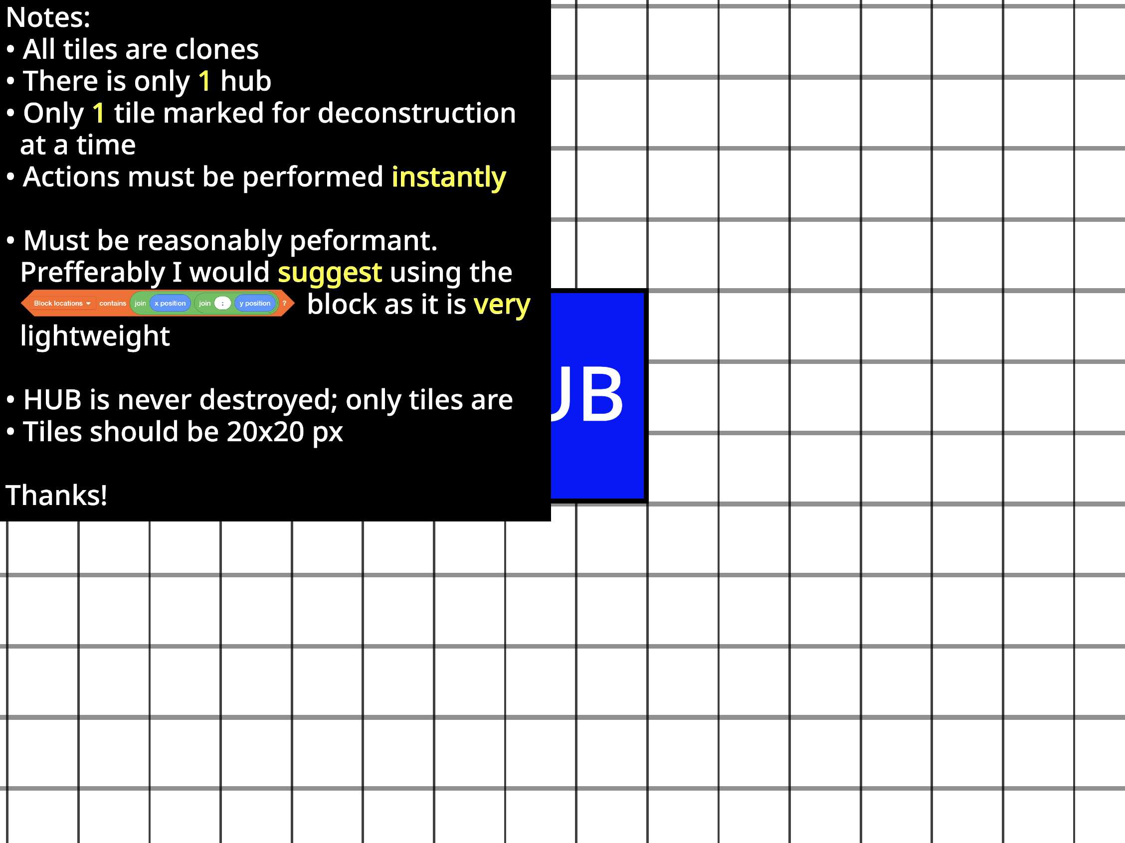 The game revolves around building factories, and you must build hundreds to thousands of machines. The tile code has to be reasonably performant and lightweight (i.e no constant checking, no touching blocks, no messages, etc).